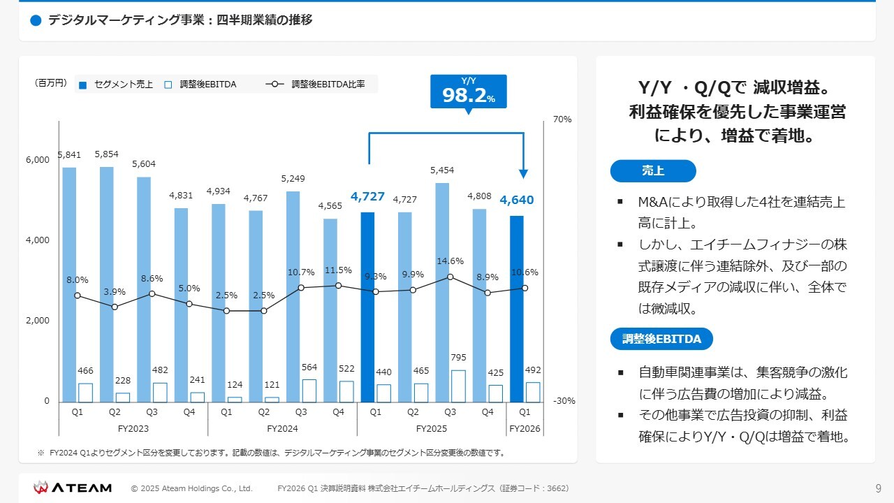 調整後EBITDAについては、自動車関連事業のメディア、具体的には中古車の送客サービスにおいて、集客競争の激化に伴う広告費の増加が要因となり、減益となりました。
