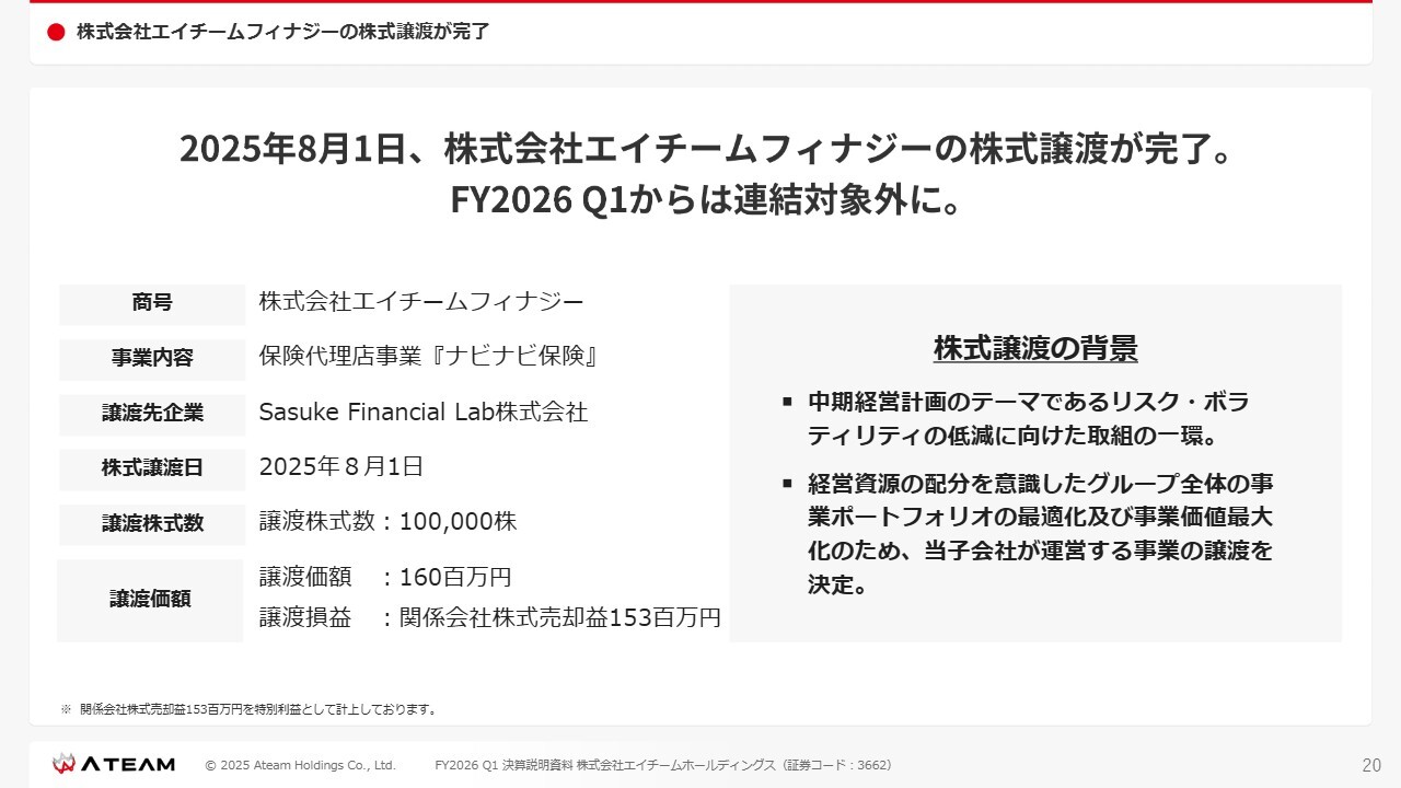 2つ目のトピックです。2025年8月1日、株式会社エイチームフィナジーの株式譲渡が完了しました。同社は保険代理店事業「ナビナビ保険」というサービスを展開していましたが、Sasuke Financial Lab株式会社に対して、スライドに記載の価額で株式譲渡を実施しました。