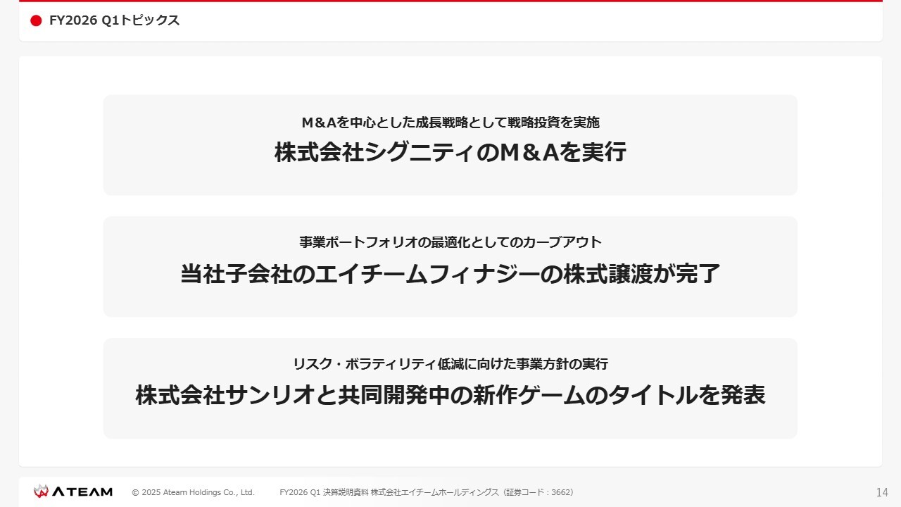 FY2026第1四半期のトピックスは、スライドに記載の3点です。1点目は、株式会社シグニティのM&Aを実行したことです。2点目は、当社子会社であったエイチームフィナジーの株式譲渡が完了したことです。3点目は、株式会社サンリオと共同開発中の新作ゲームのタイトルを発表したことです。
