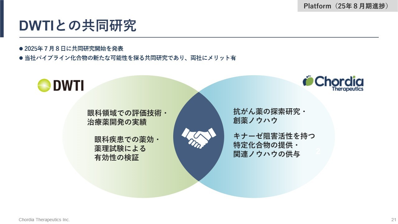 「rogocekib」以外のパイプラインについては、がん以外の適応可能性も共同研究を通じて探索しています。デ・ウエスタン・セラピテクス研究所(DWTI)とは、当社化合物の眼科領域、すなわち眼の疾患への活用可能性を共同で研究しています。
