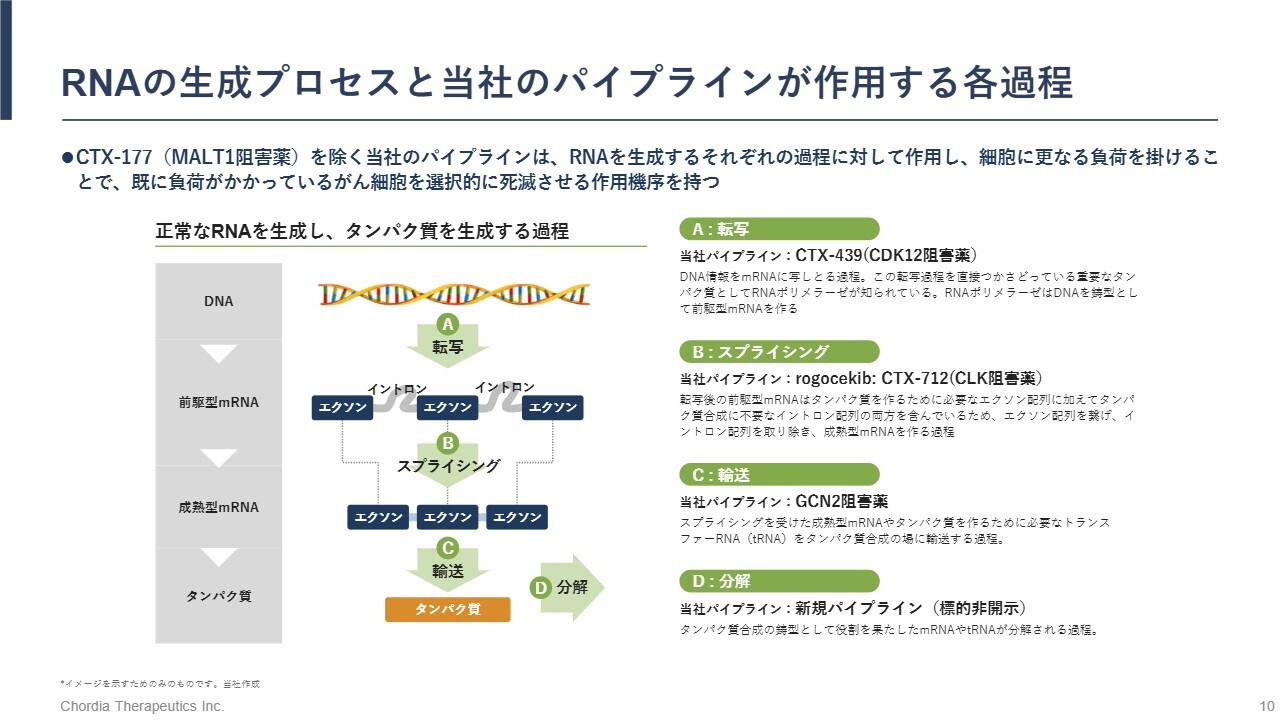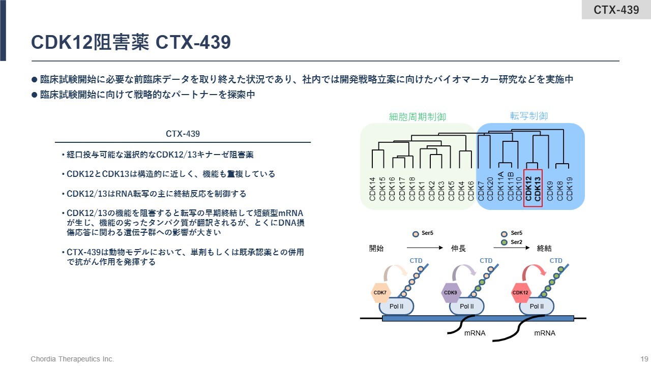CDK12阻害薬は「CTX-439」という化合物の前臨床データを取り終えています。CDK12はRNAの転写反応における主に終結ステップを制御するキナーゼです。「CTX-439」がその活性を阻害することで、転写が早期に終結し、異常なRNAが生じます。これがストレスとなり、がん細胞が死滅するという仕組みです。現在、臨床試験の開始に向けて提携先を探しています。