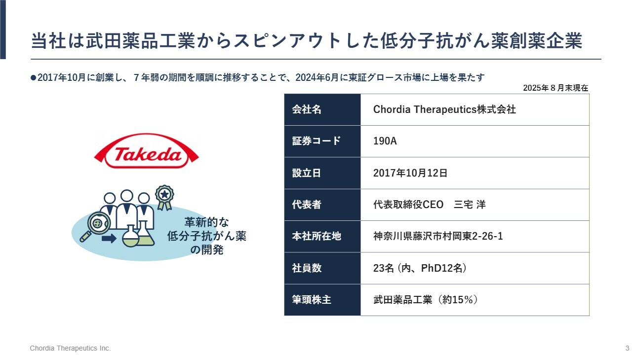 当社は2017年10月、国内最大手の製薬会社である武田薬品工業からスピンアウトし、創業しました。低分子抗がん薬の研究開発を行うバイオテックスタートアップです。2024年6月に東証グロース市場に上場しており、証券コードは190Aです。