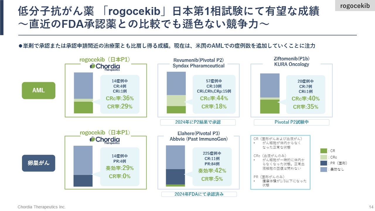 日本で実施した第1相臨床試験における「rogocekib」の成績です。AMLと卵巣がんにおいて有効性が認められています。特にAMLについては、14人中4人で完全寛解、すなわち一時的ではありますが、患者さまの体からがんが消えた状態を達成しており、良い成績であったと考えています。この結果は、直近で米国食品医薬品局(FDA)からAML適用で承認を受けた他社の単剤と同等水準であると当社では見ています。