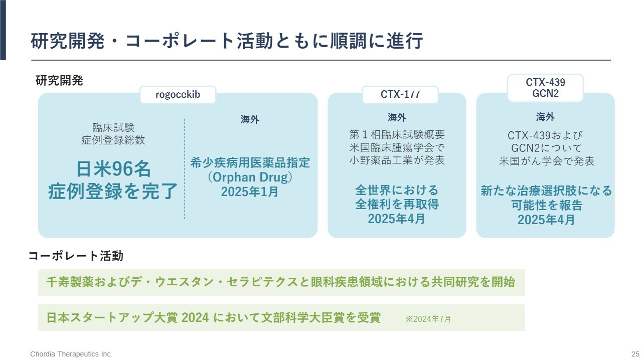 事業の振り返りと今後の見通しについてです。「rogocekib」の開発に関しては、Project Optimus対応に伴い米国試験の開発スケジュールを変更しましたが、臨床試験の症例組入れ自体はおおむね計画どおりに進んでいます。8月末時点で、36症例に加え、日本での60症例を含めて、これまでに96症例に対する投与を実施しています。また、FDAからのオーファンドラッグ指定も獲得しました。