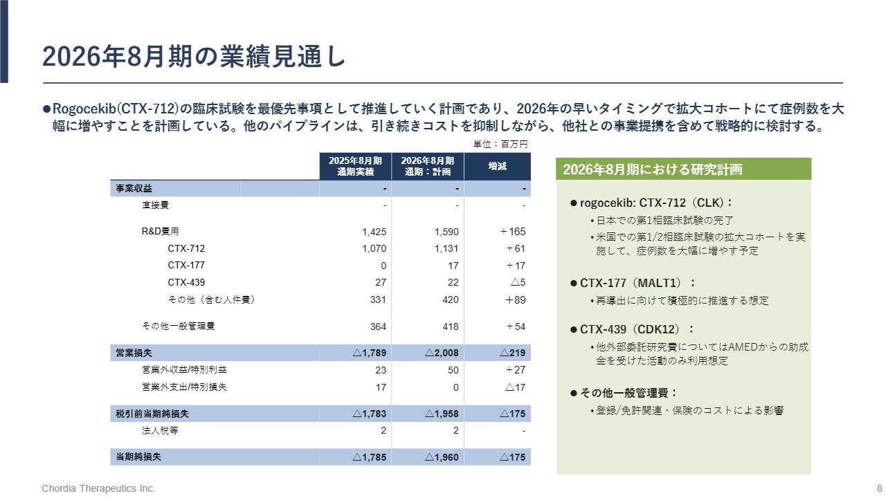 2026年8月期の業績見通しです。引き続き「rogocekib」の開発を最優先で進め、2026年の早いタイミングで拡大コホートを開始し、症例数を大幅に増やす計画です。その他のパイプラインに関しては、コストを抑制しつつ、他社との事業提携を含めて戦略的に検討していく予定です。