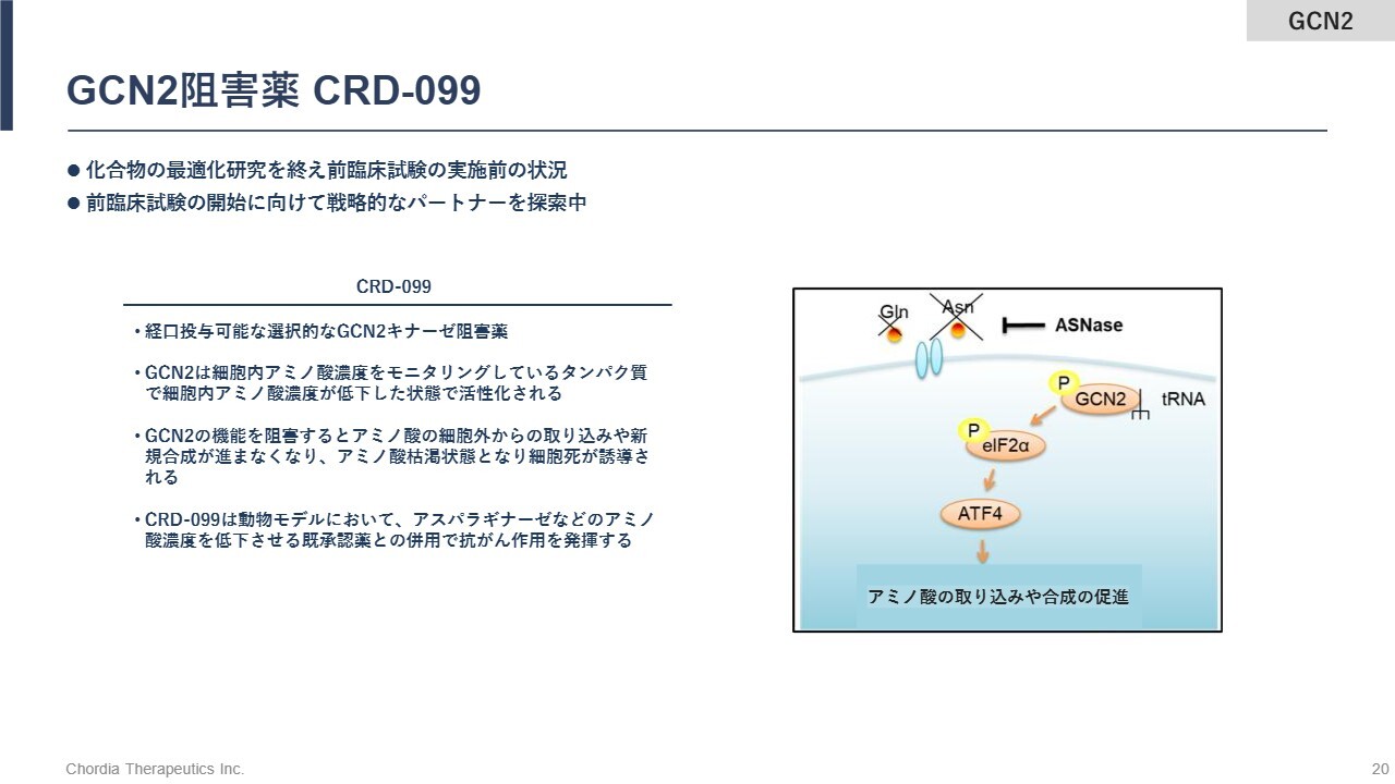GCN2阻害薬は、細胞内のアミノ酸濃度をモニタリングしているキナーゼです。その活性を阻害すると、RNAからタンパク質が生成される翻訳反応に異常が生じ、細胞にストレスが発生します。その結果、がん細胞が死滅します。このプロジェクトはまだ探索研究の段階ですが、「rogocekib」にリソースを集中させているため、提携先を探しています。