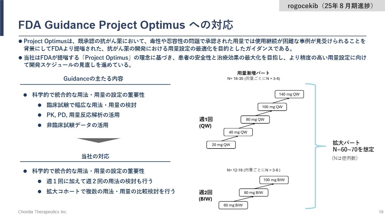 これらのマイルストンは、FDAが提唱するProject Optimusへの対応として、当初の予定を見直した結果です。米国での承認申請に向けて、Project Optimusへの対応は必要なものと認識しており、「rogocekib」の価値最大化を目指した戦略的な判断と考えていますので、ご承知おきください。