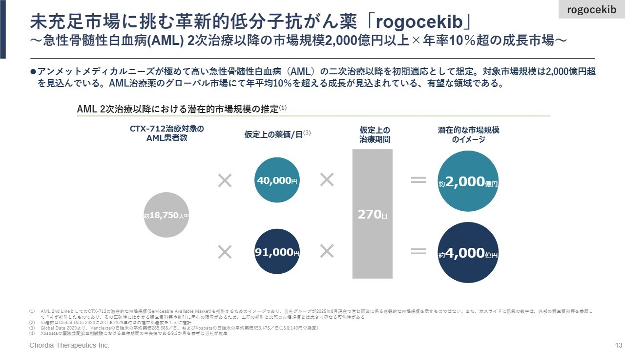 さらに、AML治療薬市場はグローバルで年率10パーセント以上の成長が予測されており、今後も拡大が期待される有望な領域です。もちろん、そのすべてを「rogocekib」が獲得できるわけではありませんが、例えばその半分を獲得するだけでも、ピークセールスは年商1,000億円を超える、いわゆるブロックバスター医薬品に成長する可能性があります。