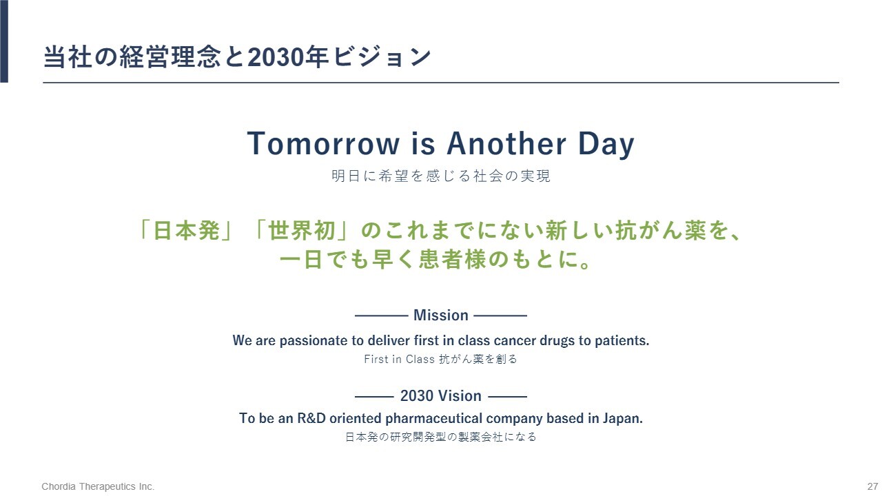 最後に、当社の経営理念についてです。当社は、日本に本社を有するバイオテック企業として、既存薬とは異なる働きをする新しい抗がん薬を世界中のがんと闘う患者さまに届けることで、患者さまやそのご家族が「明日になれば、今日よりも良い治療を受けられる」と、明日に希望を感じられる社会の実現を目指しています。
