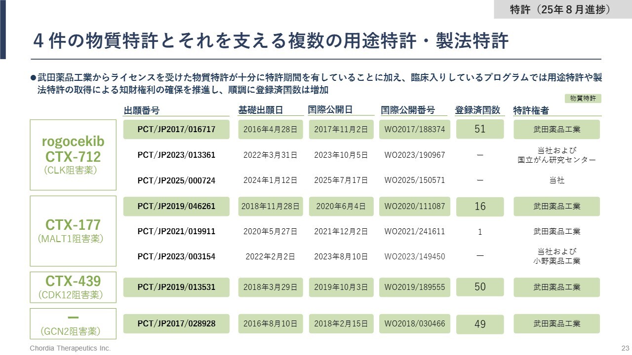 特許の状況です。「rogocekib」「CTX-177」「CTX-439」およびGCN2阻害薬の物質特許に関しては、各国や地域での登録が順調に進んでいます。また、臨床段階にある「rogocekib」と「CTX-177」については、用途特許や製法特許なども出願し、知財権利の確保を進めています。