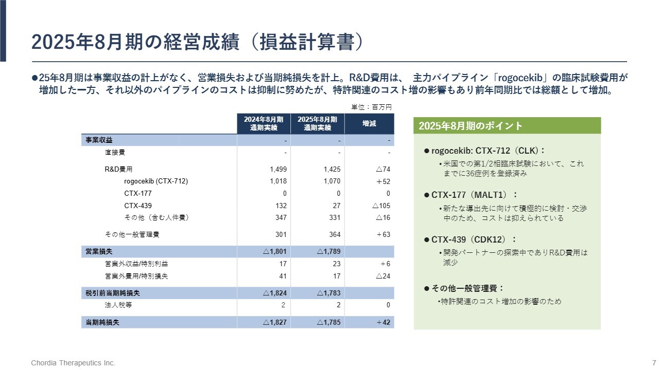 三宅洋氏(以下、三宅):Chordia Therapeutics株式会社代表取締役の三宅洋です。本日は、2025年8月期決算についてご説明します。どうぞよろしくお願いします。