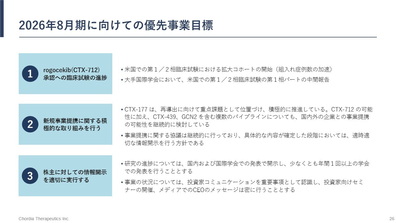2026年8月期の優先事業目標です。まず、「rogocekib」の開発を着実に進めていく方針です。また、事業開発活動は「CTX-177」を中心に進めていきます。こちらについては、小野薬品工業が実施した臨床試験のデータのすべてを受領しており、このデータを活用して臨床試験の早期再開に向けた交渉を進めていきます。