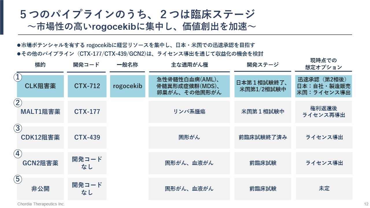 5つのパイプラインのうち、2つは臨床ステージ~市場性の高いrogocekibに集中し、価値創出を加速~
