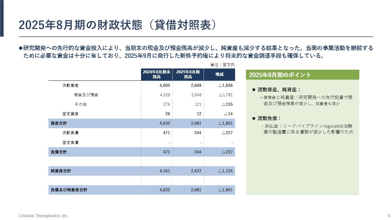 2025年8月期の業績です。財政状態は、8月末時点で約25億円の現金および預金を保有しており、当面の事業活動を継続するための資金は十分に確保しています。また、リードパイプライン「rogocekib」の開発資金を中期的に確保するため、新株予約権による資金調達も進めています。