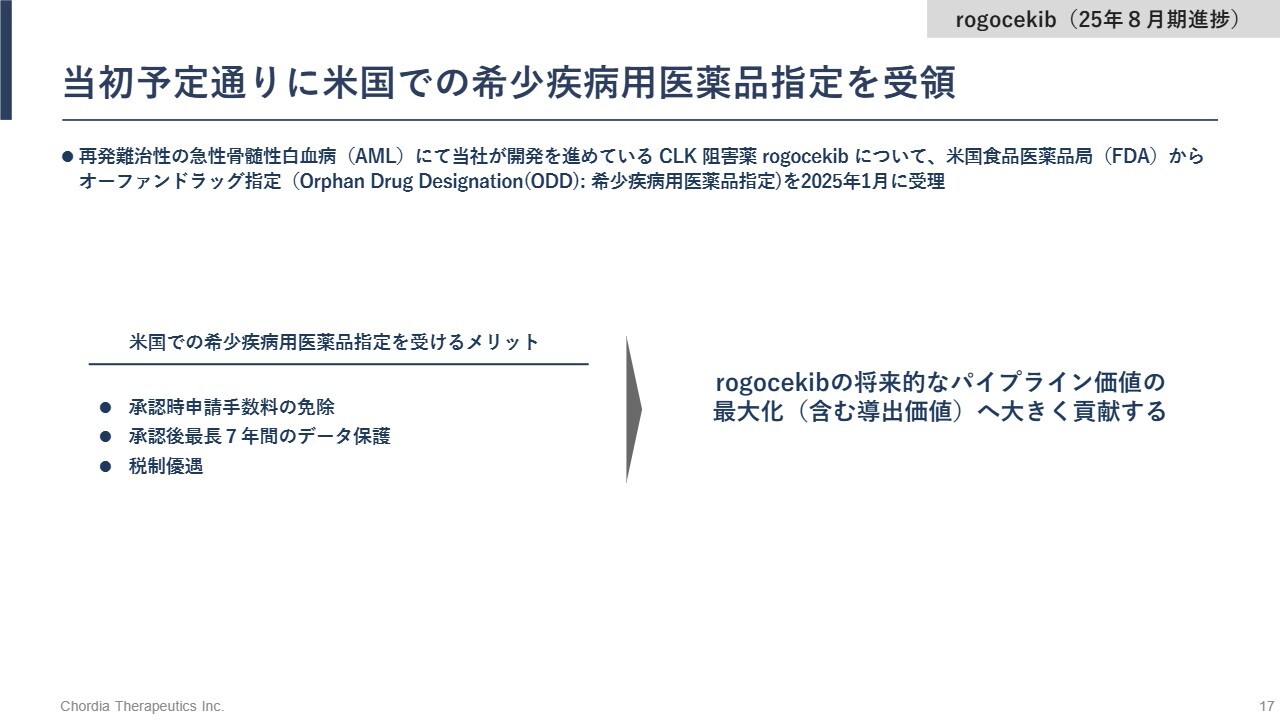当社は、この指定を単なる優遇措置の獲得と捉えておらず、規制当局、特に米国のFDAとしっかりコミュニケーションを取りながら「rogocekib」の価値を示すことができている良い実例になっていると考えています。