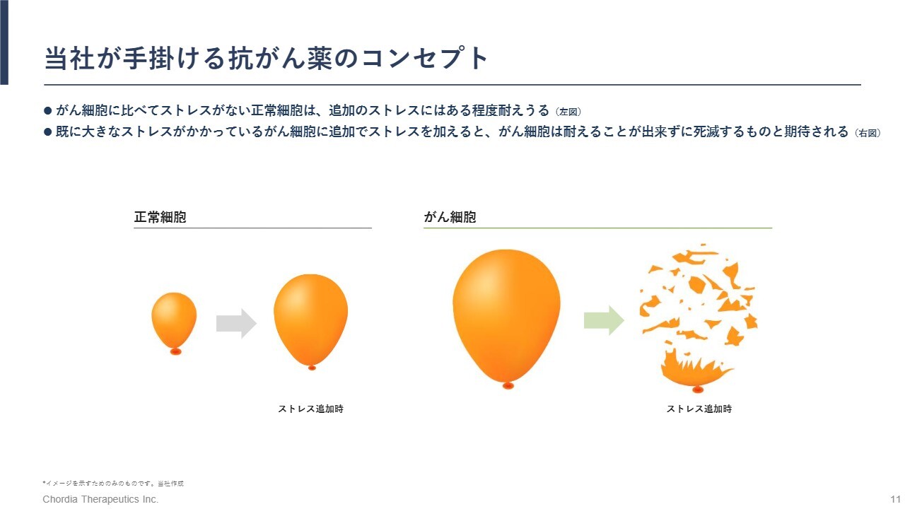 がん細胞はストレスを蓄積しており、風船が膨らんだ状態です。一方、正常細胞はストレスを受けない状態で生存しているため、風船は小さいです。ここに当社のパイプラインが追加のストレスを加えると、正常細胞はそのストレスに対処できますが、がん細胞は追加のストレスに耐えきれず、風船が破裂するように死滅していきます。