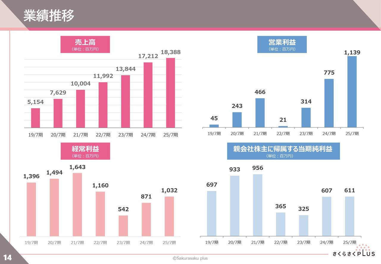 売上高は、2019年7月期の51億5,400万円から2025年7月期には183億8,800万円、営業利益は2019年7月期の4,500万円から2025年7月期には11億3,900万円へと拡大しました。
