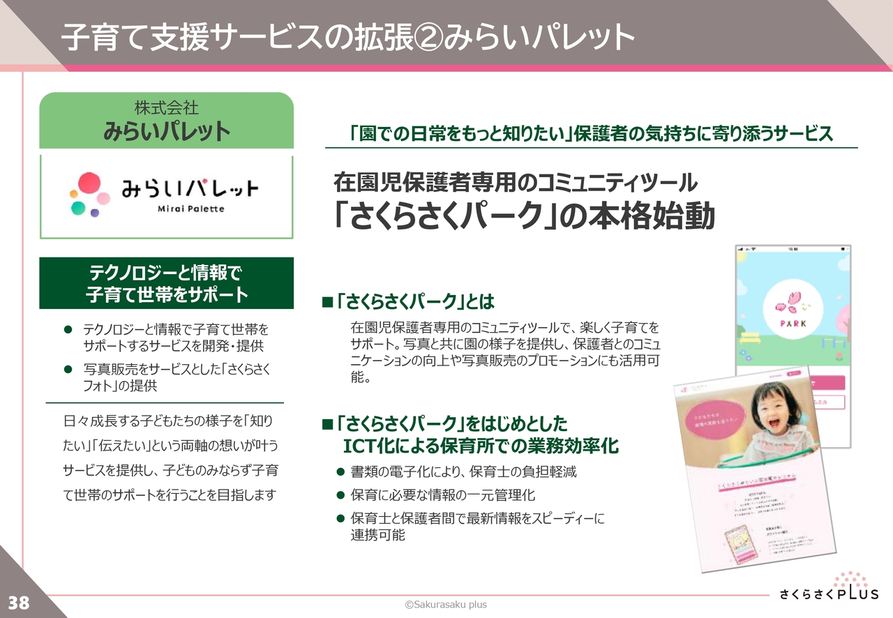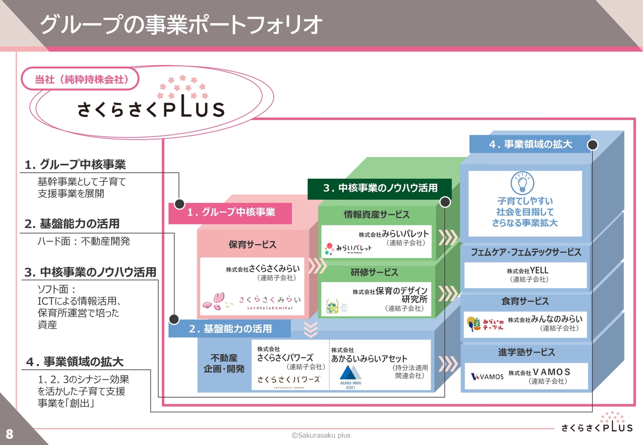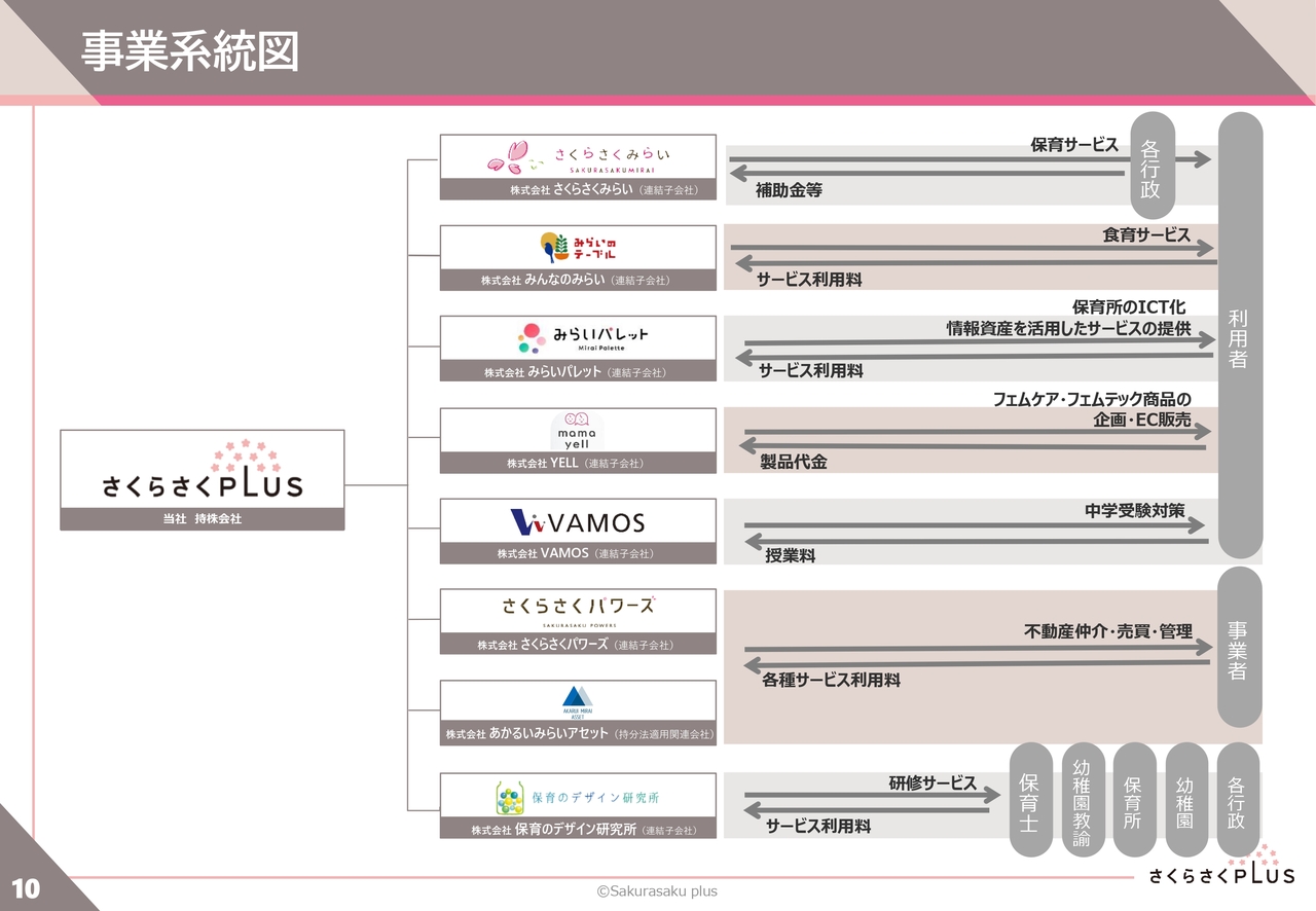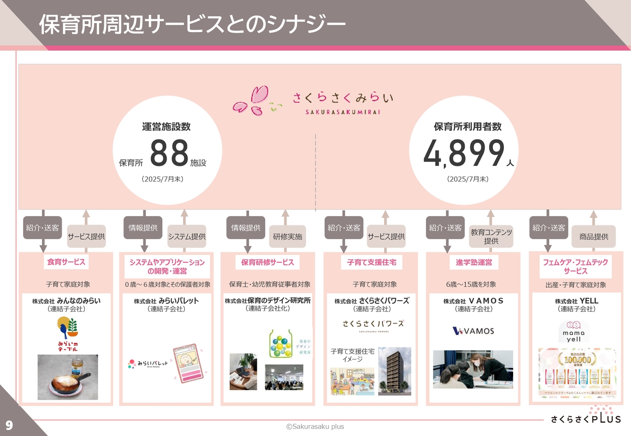 まず、保育サービスを展開するのは、連結子会社のさくらさくみらいです。また、情報資産を活用したサービスを提供するみらいパレット、進学塾サービスを展開するVAMOS、食育サービスを提供するみんなのみらいも、いずれも連結子会社です。