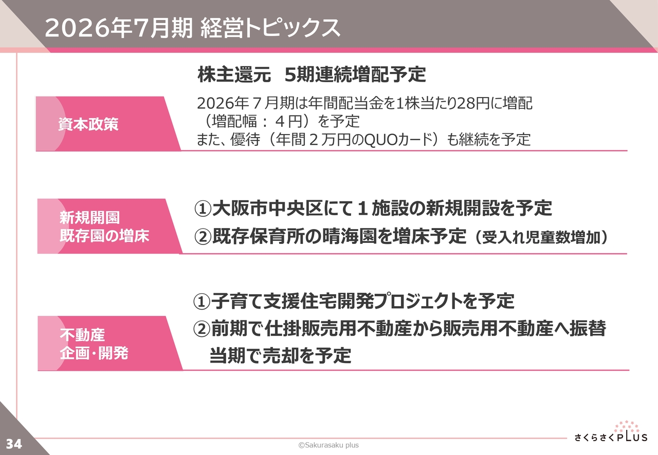 まず、株主還元の観点では、5期連続となる増配を予定しており、年間配当金は前年比プラス4円となる1株当たり28円を予定しています。また、年間2万円分のQUOカードによる株主優待も継続して実施する予定です。