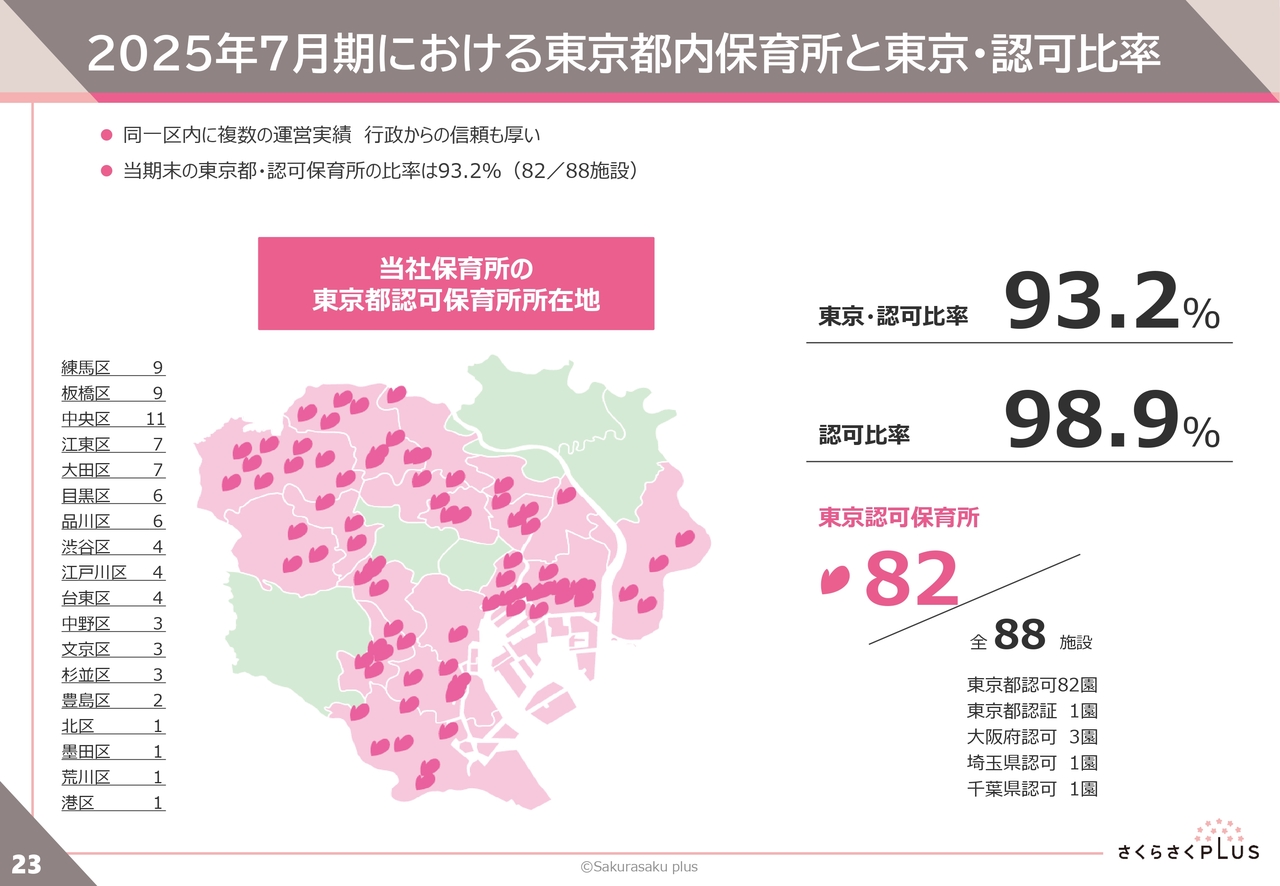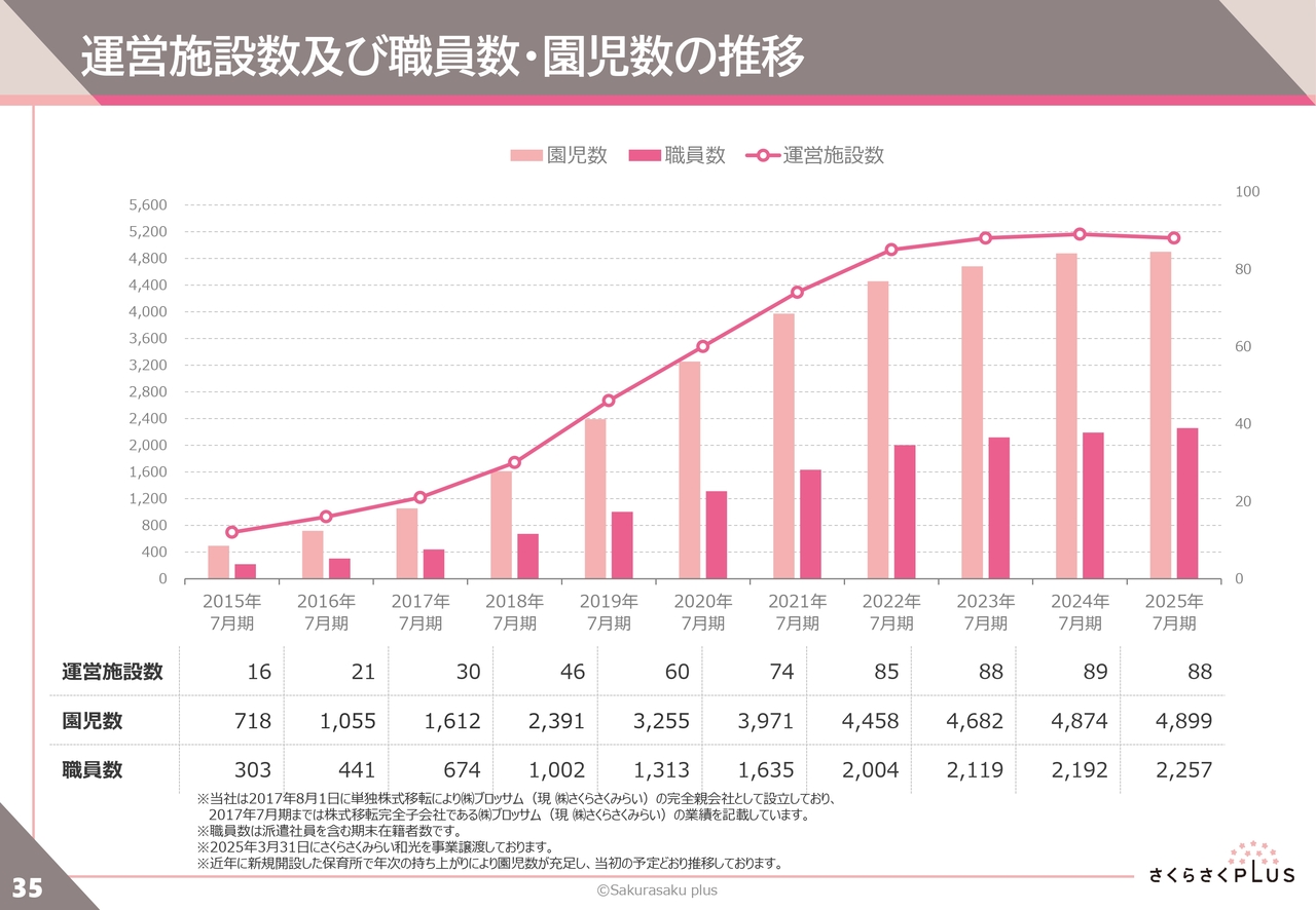 運営施設数は2015年7月期の16施設から、2025年7月期には88施設へと拡大しました。現在では、近年新規開設した保育所で年次の持ち上がりにより園児数が充足し、おおむね当初の想定どおり推移しています。なお、2025年3月31日に「さくらさくみらい和光」は事業譲渡しています。