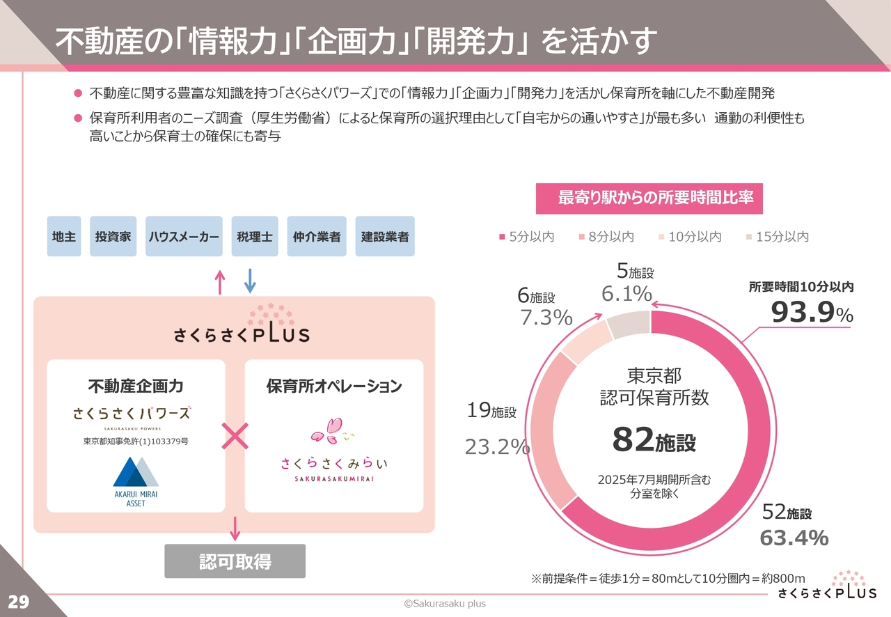 スライド左側の図に示すように、当社グループでは、地主・投資家・ハウスメーカー・税理士・仲介業者・建設業者など、多様なステークホルダーとの協力体制を構築しています。さくらさくパワーズが不動産の企画・開発を担い、さくらさくみらいが保育所の運営を担当することで、認可取得までのプロセスを一貫してグループ内で完結できることが大きな強みです。