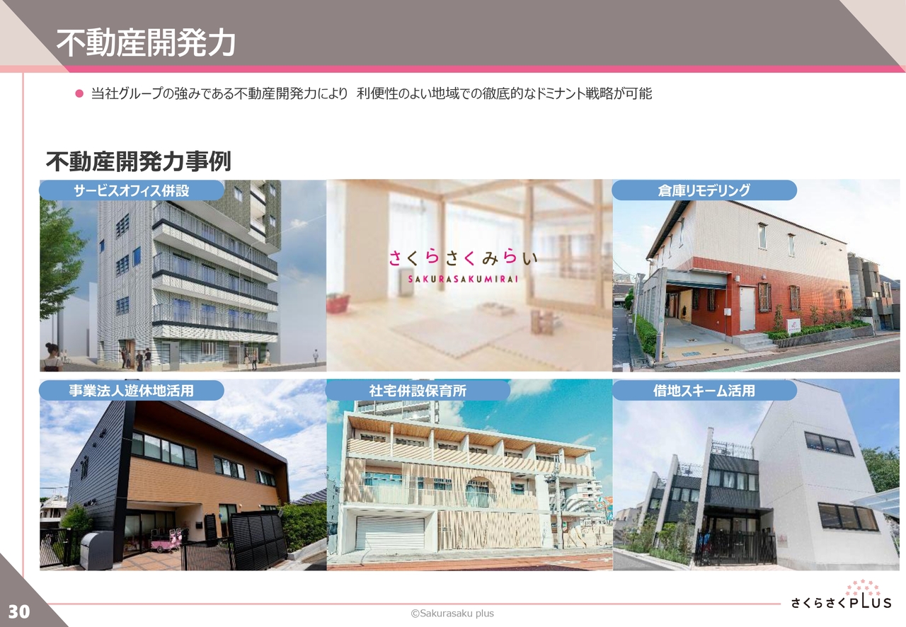 当社グループの強みである不動産開発力を活かすことで、利便性の高い地域におけるドミナント戦略が可能となります。具体的には、サービスオフィス併設、倉庫のリモデリング、事業法人の遊休地活用、社宅併設保育所、借地スキームの活用といった多様なスキームで展開しています。