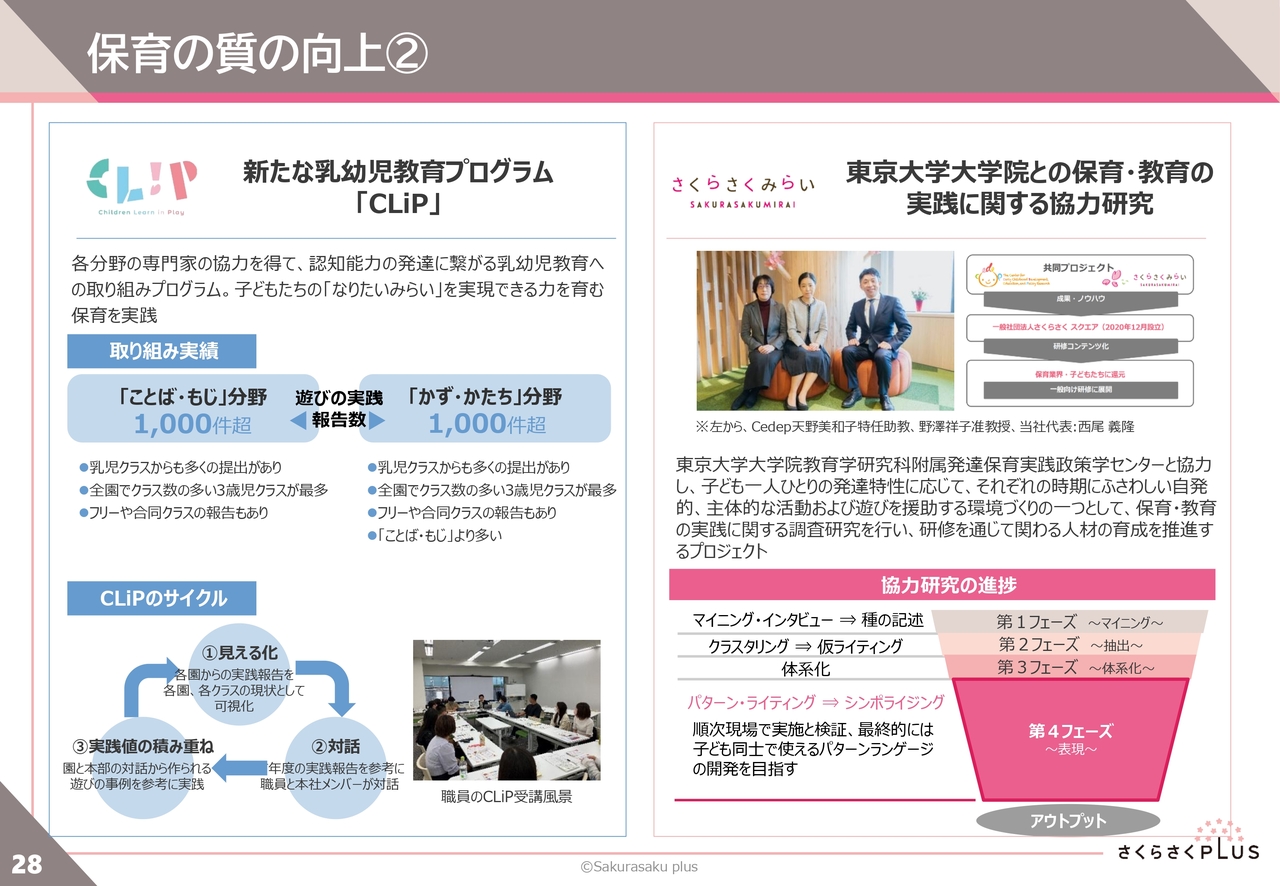これら2つの取り組みは、いずれも「保育の質を高める」という共通の理念のもとにあります。「CLiP」では子どもたちの学びの質を、東京大学との協力研究では保育者の専門性を高め、現場から生まれる実践知を未来につなげる取り組みを続けています。