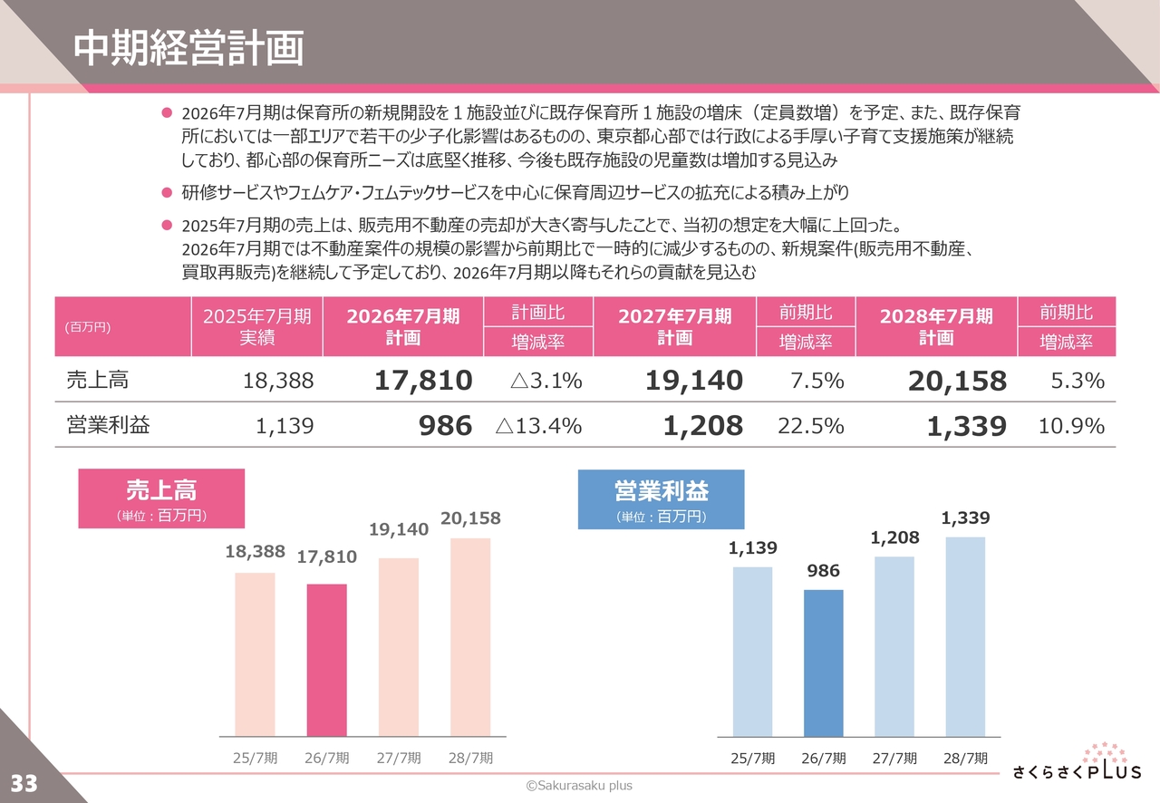 営業利益については、2025年7月期が11億3,900万円、2026年7月期は9億8,600万円と前期比マイナス13.4パーセントの減益を見込んでいます。その後、2027年7月期には12億800万円、2028年7月期には13億3,900万円まで増加する計画です。