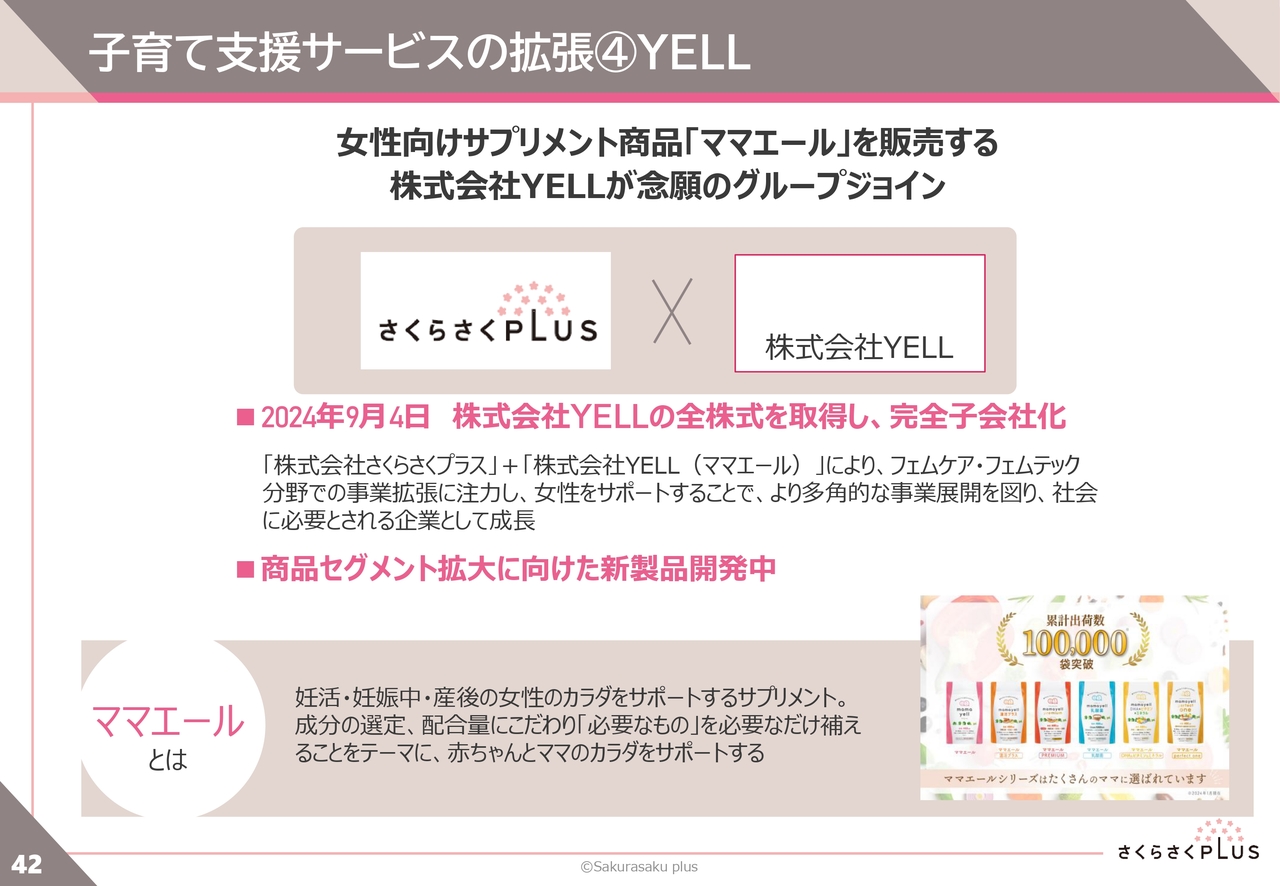 当社は、2024年9月4日に、女性向けサプリメント商品「ママエール」を販売するYELLの全株式を取得し、完全子会社化しました。これにより、フェムケア・フェムテック分野への本格参入を果たしています。