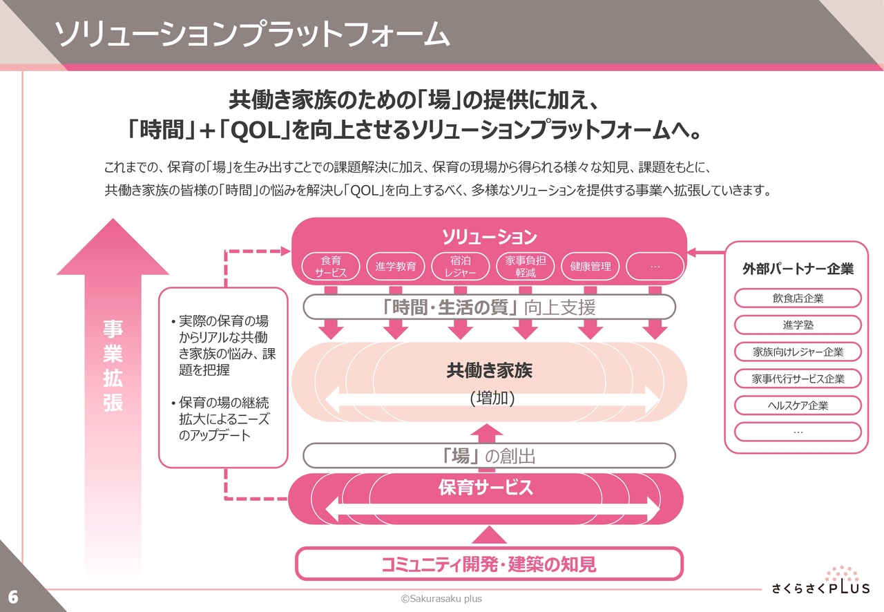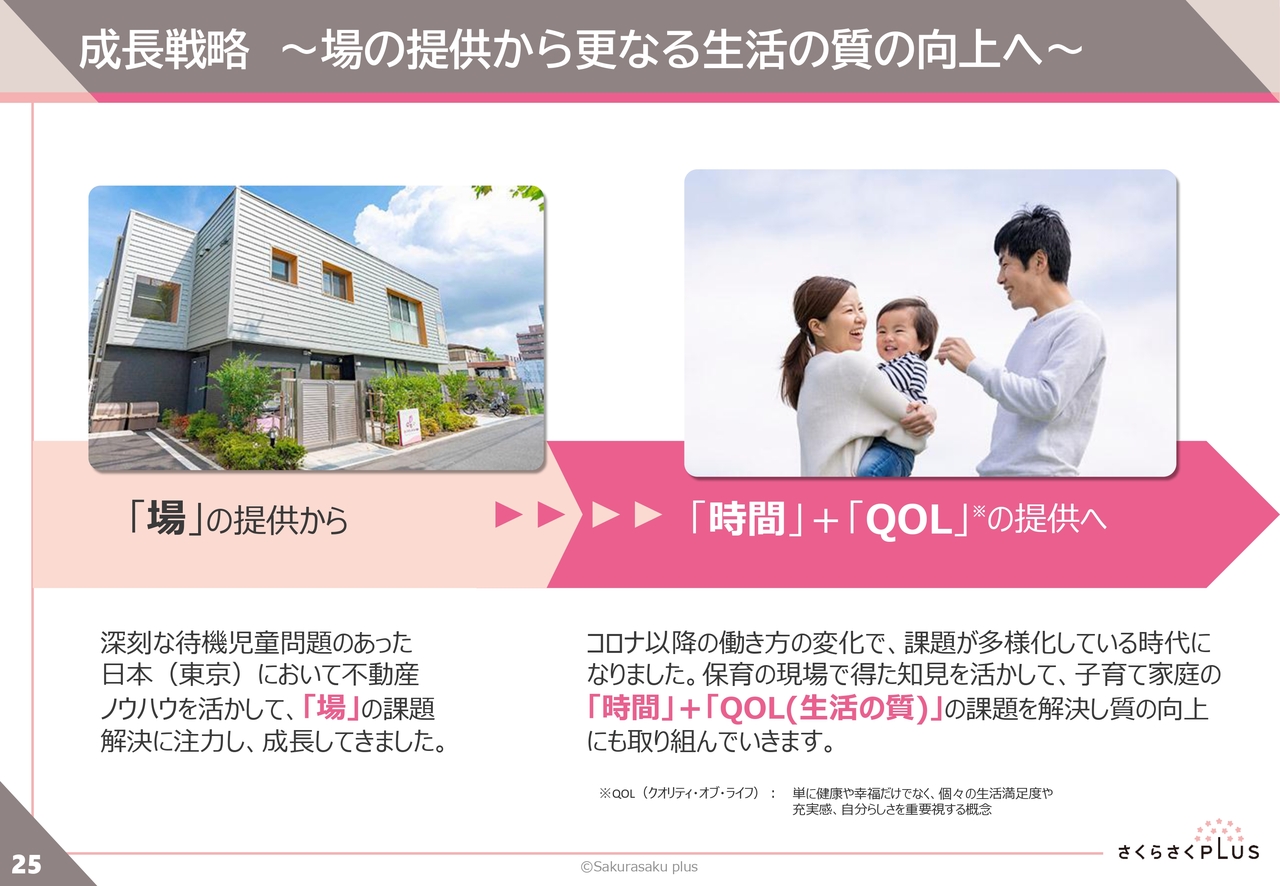 当社は、共働き家族のために保育の「場」を提供してきましたが、今後はそれに加えて、「時間」と「QOL」を向上させるための多様なサービスを提供する事業へと拡張していきます。