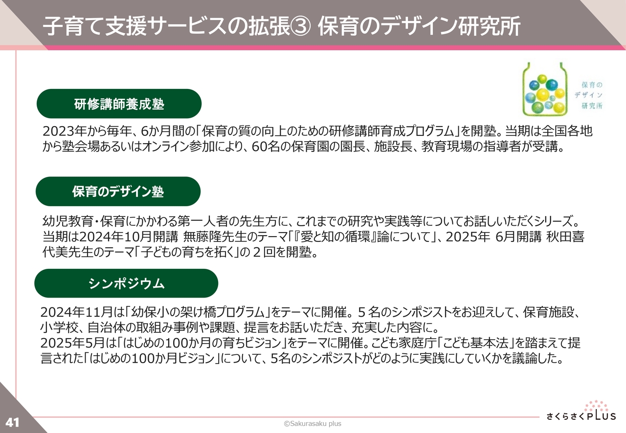 当社グループの一員である保育のデザイン研究所では、日本全国の保育に関わる人々に向けて、質の高い研修やコンサルティングを提供しており、「子どもも大人も自分らしく輝いていける社会」を目指しています。