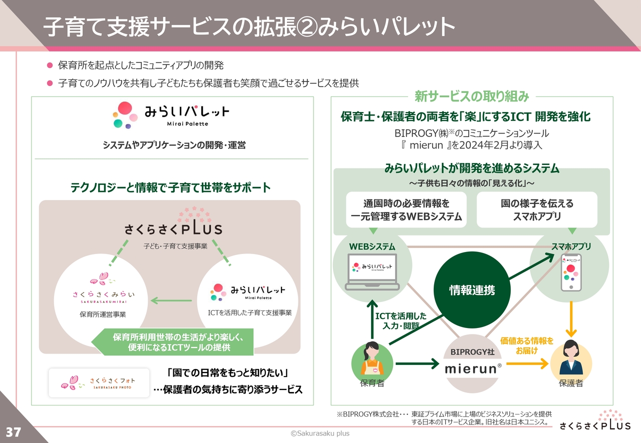 スライド右側に示しているのは、新サービスの取り組みです。みらいパレットでは、保育士・保護者の両者を「楽」にするICT開発の強化を進めており、その一環として、BIPROGY(旧・日本ユニシス)が提供するコミュニケーションツール「mierun(ミエルン)」を2024年2月より導入しました。