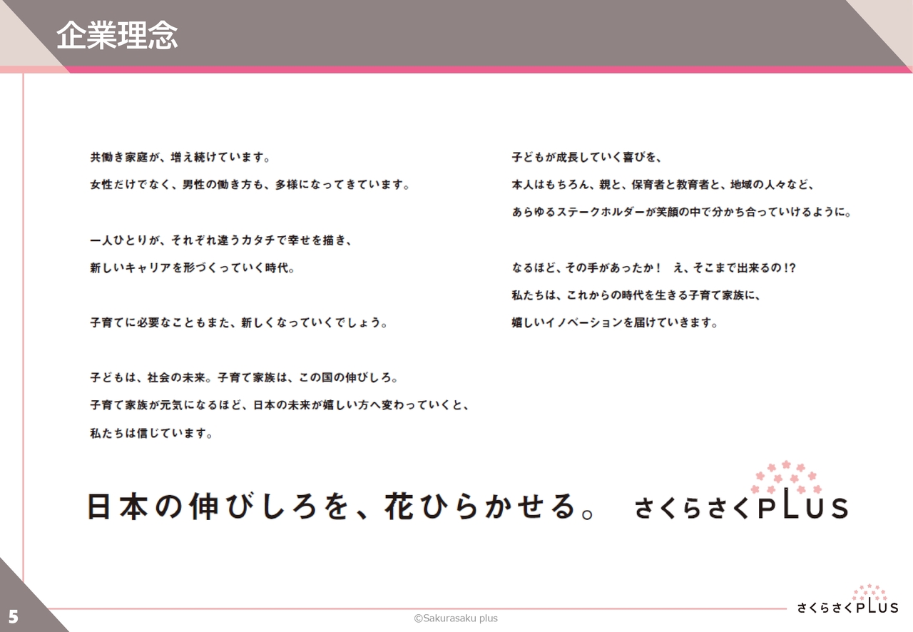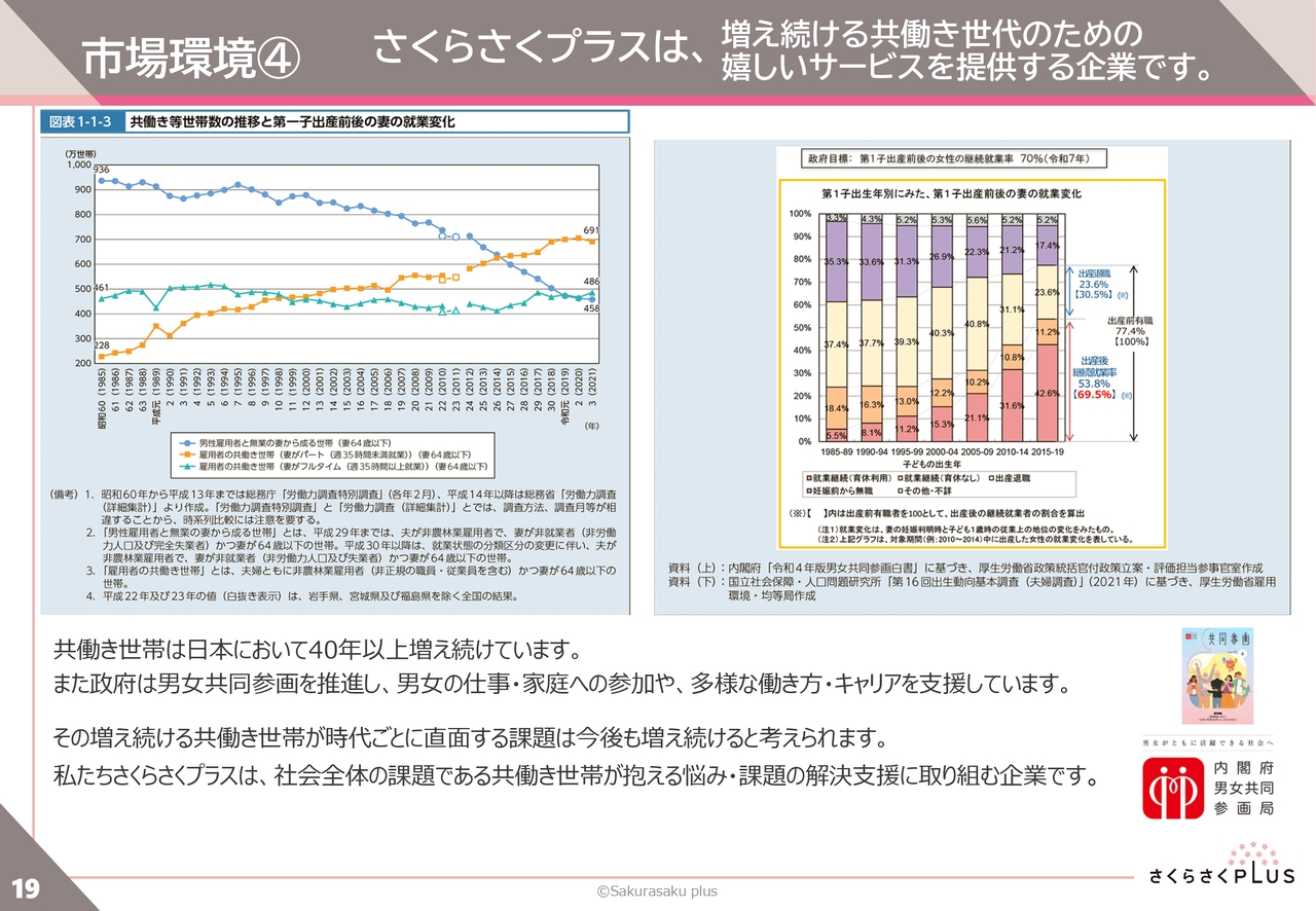 そのためには、共働きの世帯や女性への支援が必ず必要になってきます。そこを事業の柱として展開している会社だとご認識いただきたいと思います。