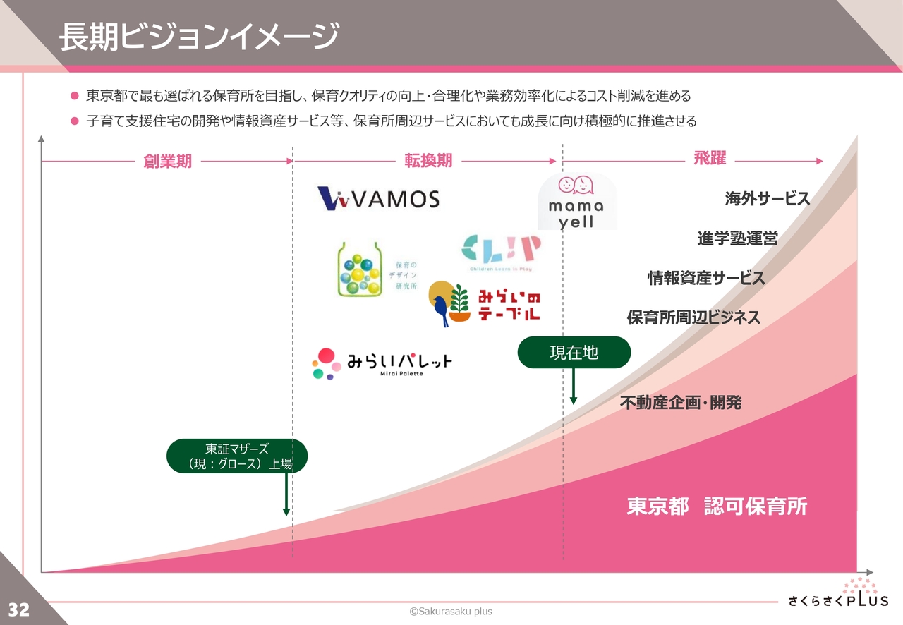まずは、長期ビジョンです。当社は、創業期から転換期を経て飛躍段階にあります。東京都で最も選ばれる保育所を目指し、保育クオリティの向上と業務効率化によるコスト削減を進めています。また、子育て支援住宅の開発や情報資産サービス等、保育所周辺サービスにおいても成⻑に向け積極的に推進していきます。