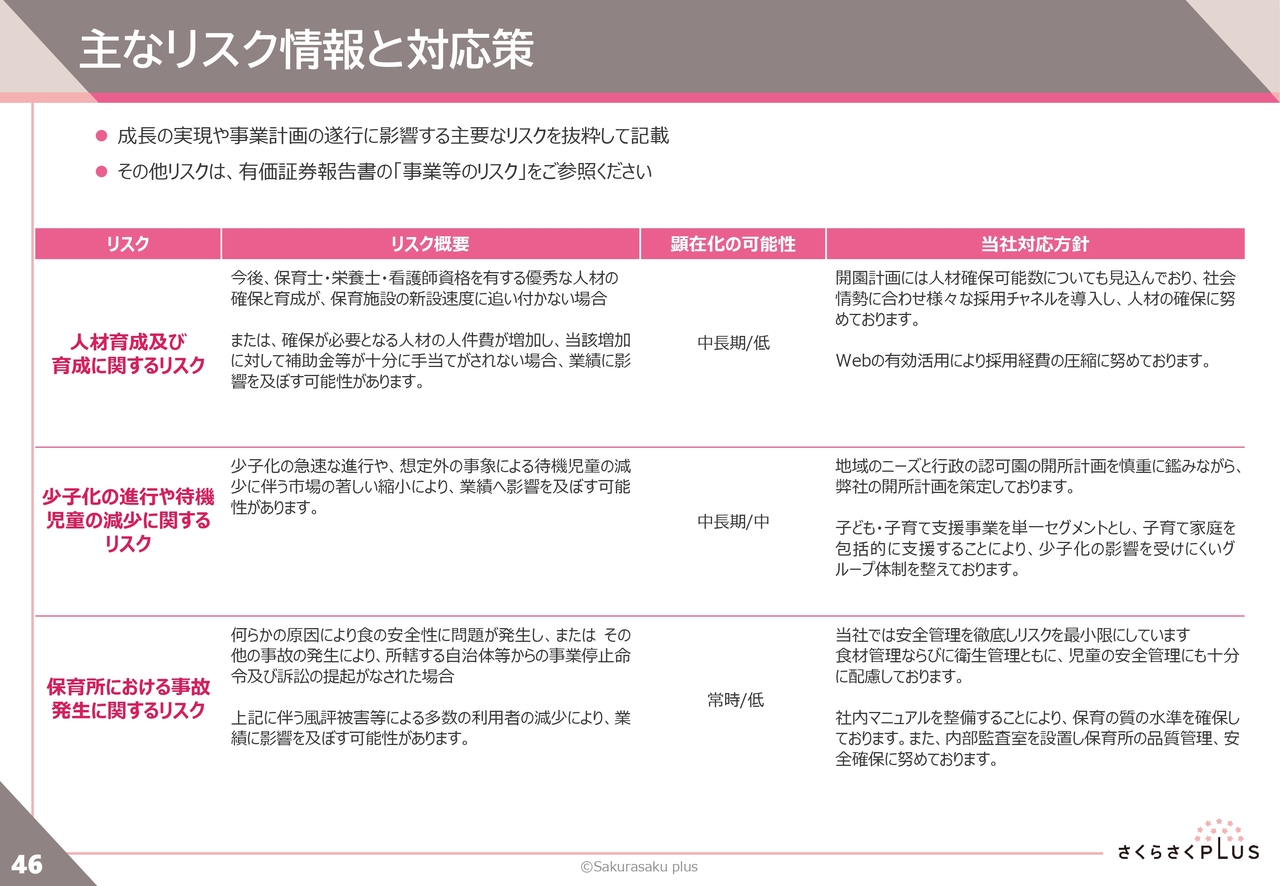 1つ目は、「人材育成及び育成に関するリスク」です。今後、保育士や栄養士、看護師資格を有する優秀な人材の確保が難しくなった場合、保育施設の新設スピードに影響を及ぼす可能性があります。また、採用が追いつかない場合には人件費の増加や補助金の手当不足が発生し、業績に影響を与えるリスクも考えられます。