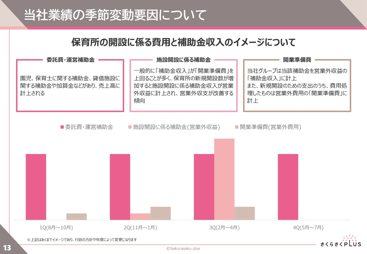 ご覧のとおり、補助金収入と開業準備費の発生時期にはずれがあり、これが当社業績の季節的な変動要因となっています。ただし、年度や行政方針によって時期が変動する場合もあるため、今後も適切に収益・費用を管理していきます。