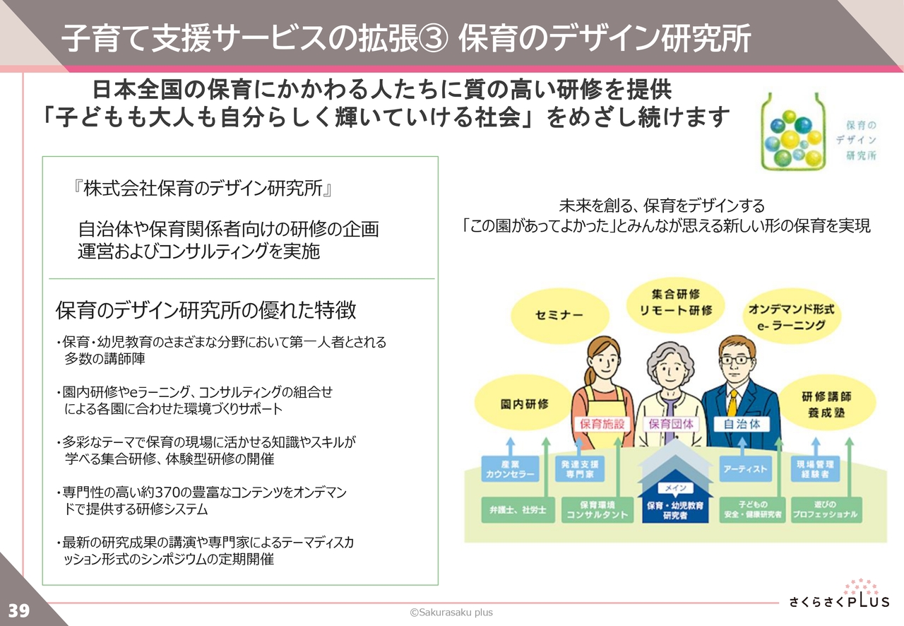 さらに、不動産仲介・売買・管理を行うさくらさくパワーズや、保育士・幼児教育従事者向けの研修サービスを手がける保育のデザイン研究所、フェムケア・フェムテック商品の企画及びEC販売を行うYELLなど、各社が多様な分野でサービスを提供しています。