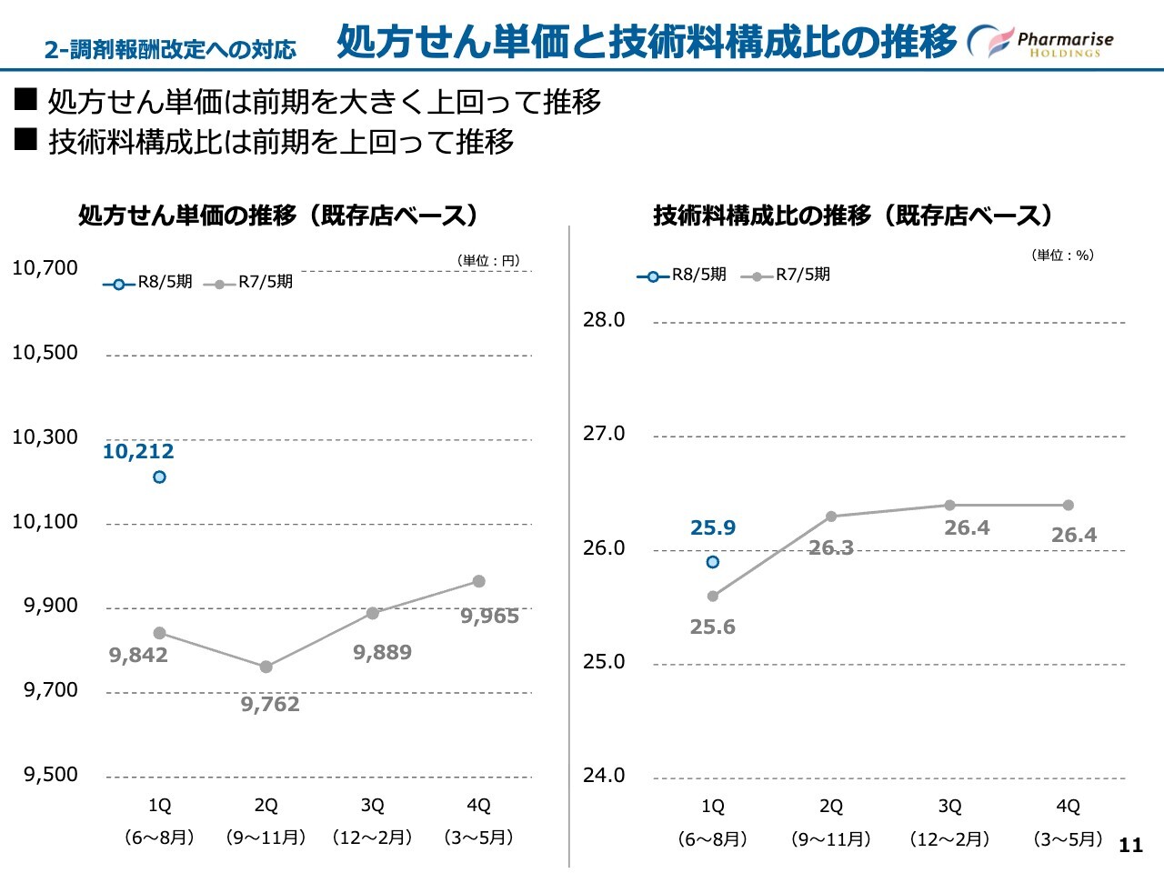 第1四半期において、処方せん単価は前期比プラス370円、3.76パーセント増の1万212円となりました。技術料構成比は前期を0.3パーセント上回る25.9パーセントとなっています。