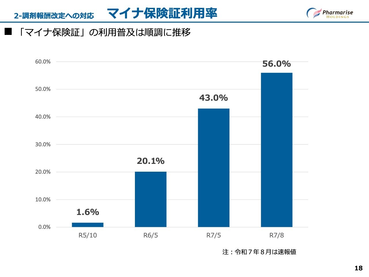 また、算定要件の1つであるマイナ保険証利用率の実績については、定期的に引き上げが行われていますが、各店舗でのマイナ保険証普及活動がしっかり実施されていることから、継続的に条件を満たし、96.4パーセントの店舗で算定しています。