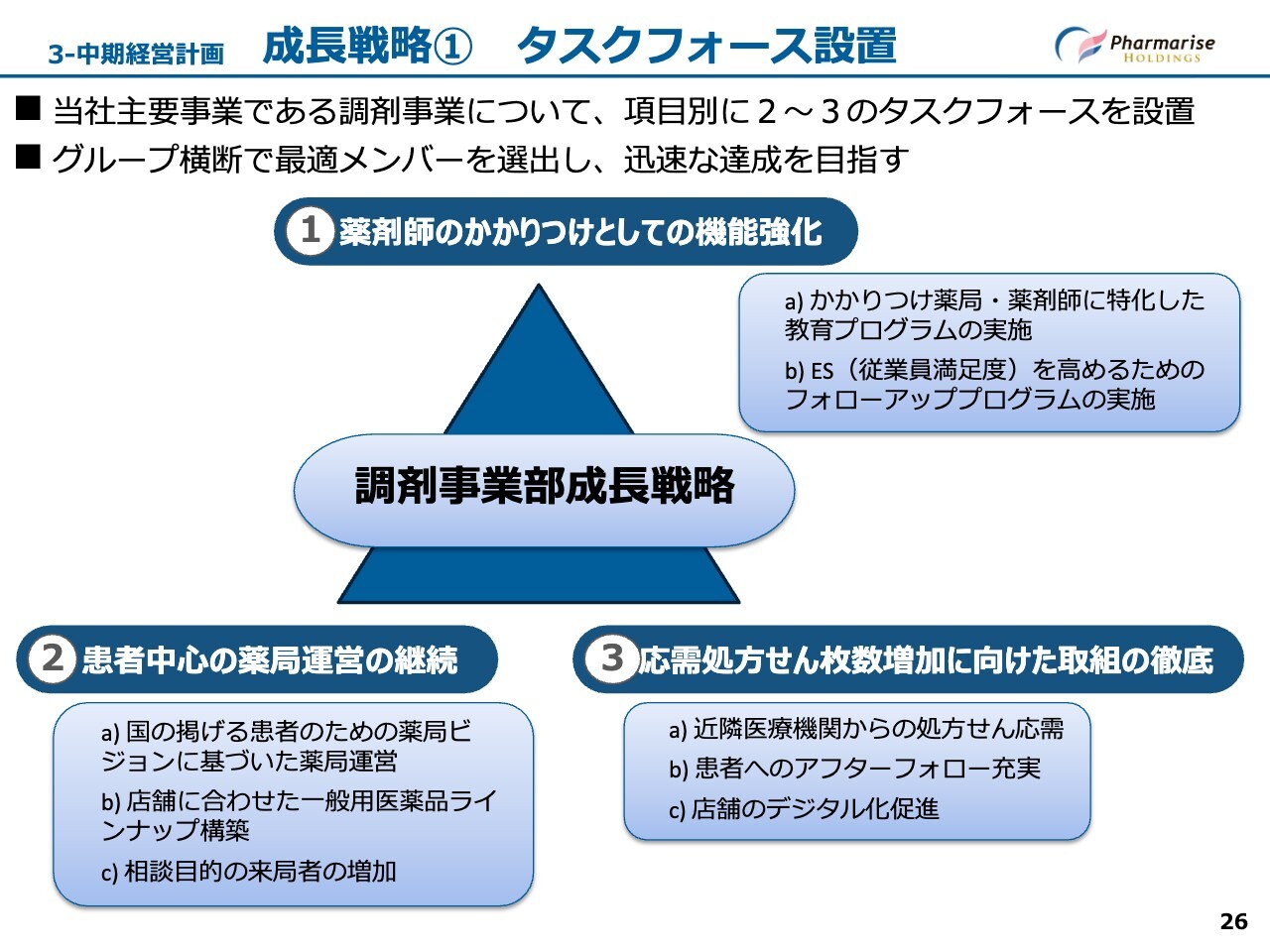 主要事業である調剤薬局事業の成長戦略については、迅速かつ確実に進捗させる必要があるため、項目ごとに2つまたは3つのタスクフォースを設置し、それぞれにオーナー、リーダー、チームメンバーを設定して、KPIの設定から進捗管理までを進めています。