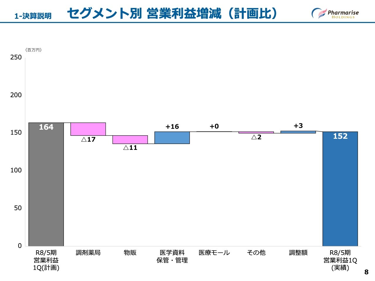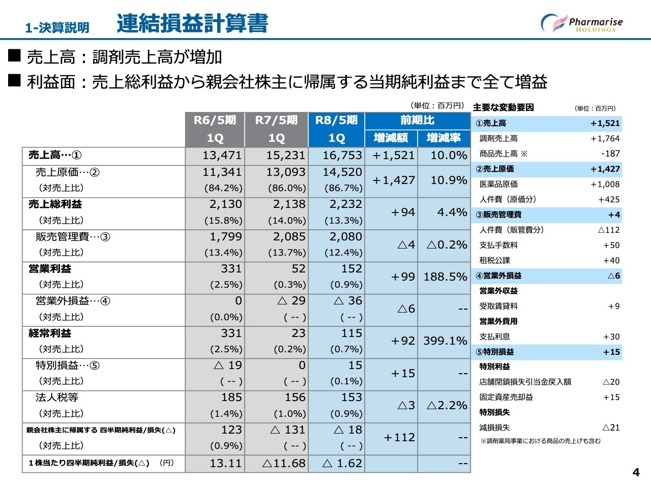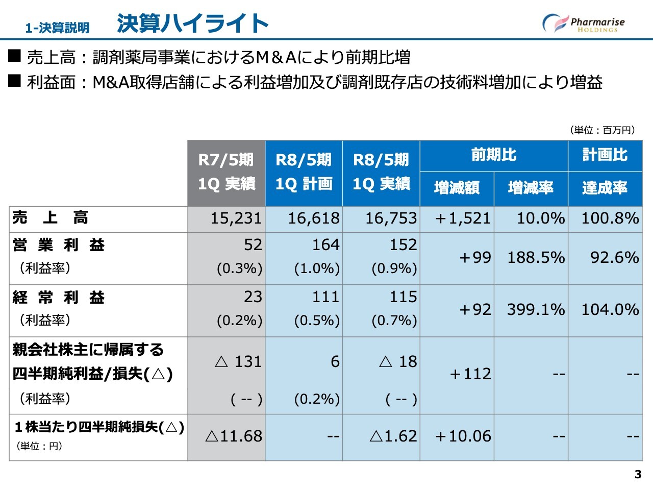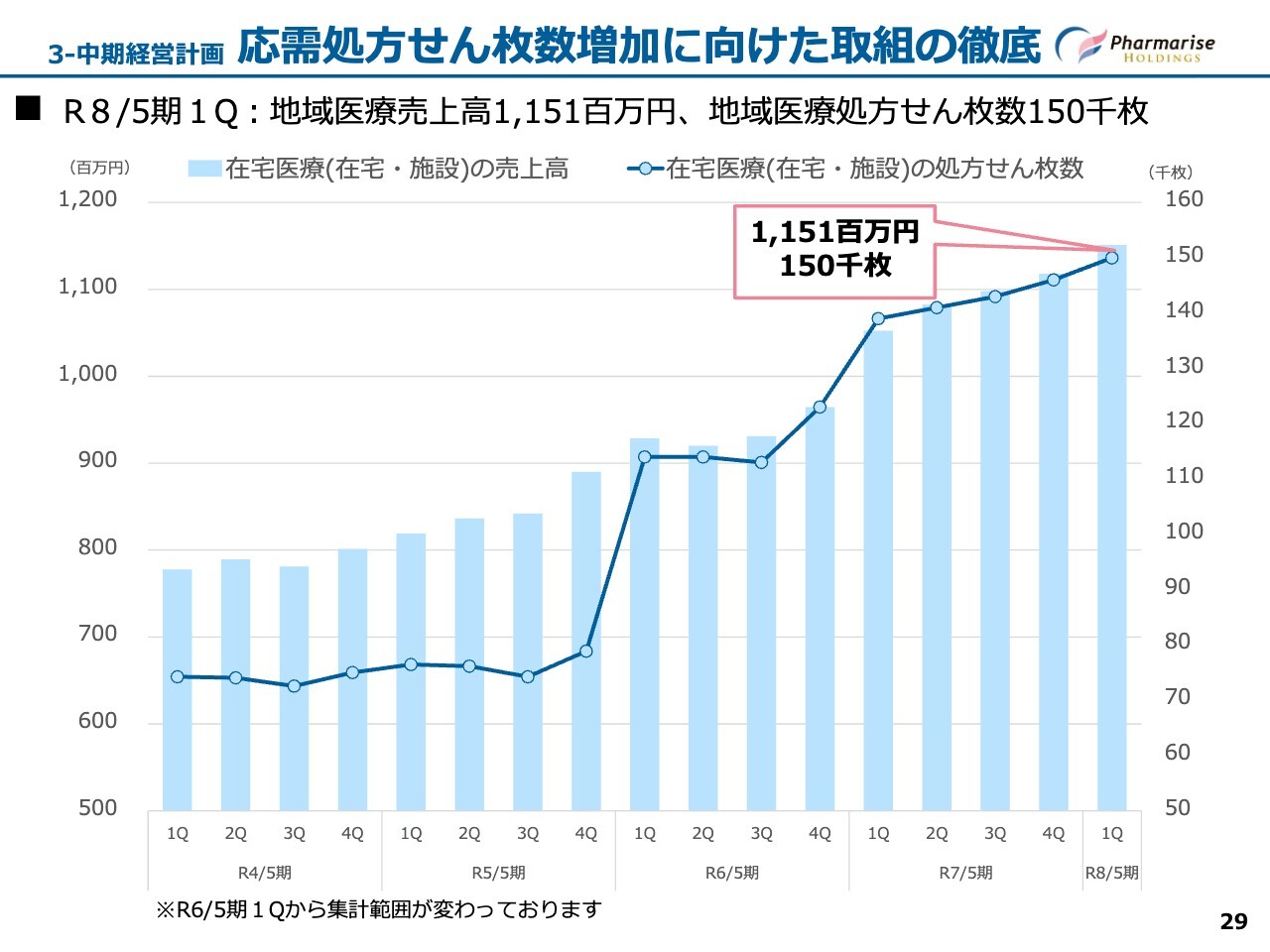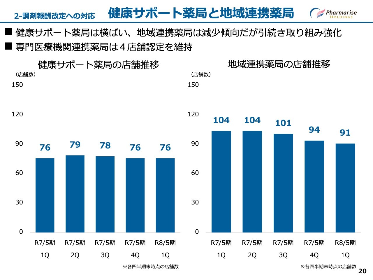 最後に、この第1四半期を総括すると、昨年実施した2件の大規模なM&Aに伴う一時的な費用、システム統一による投資、さらに300店舗を超えたことで調剤基本料や地域支援体制加算が大幅に減少するなど、業績面では厳しい状況が続いていました。