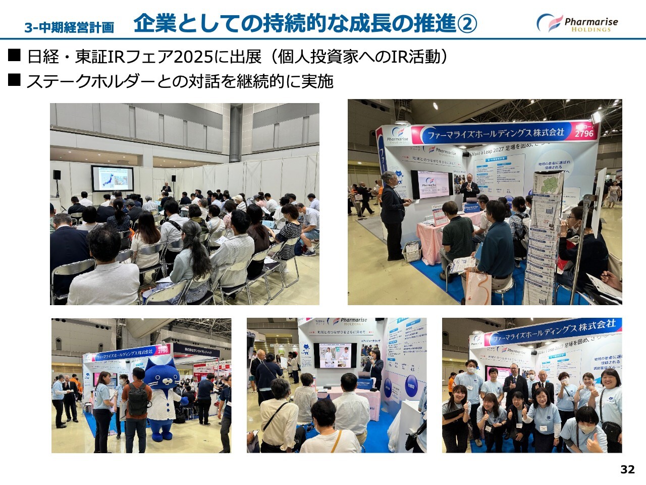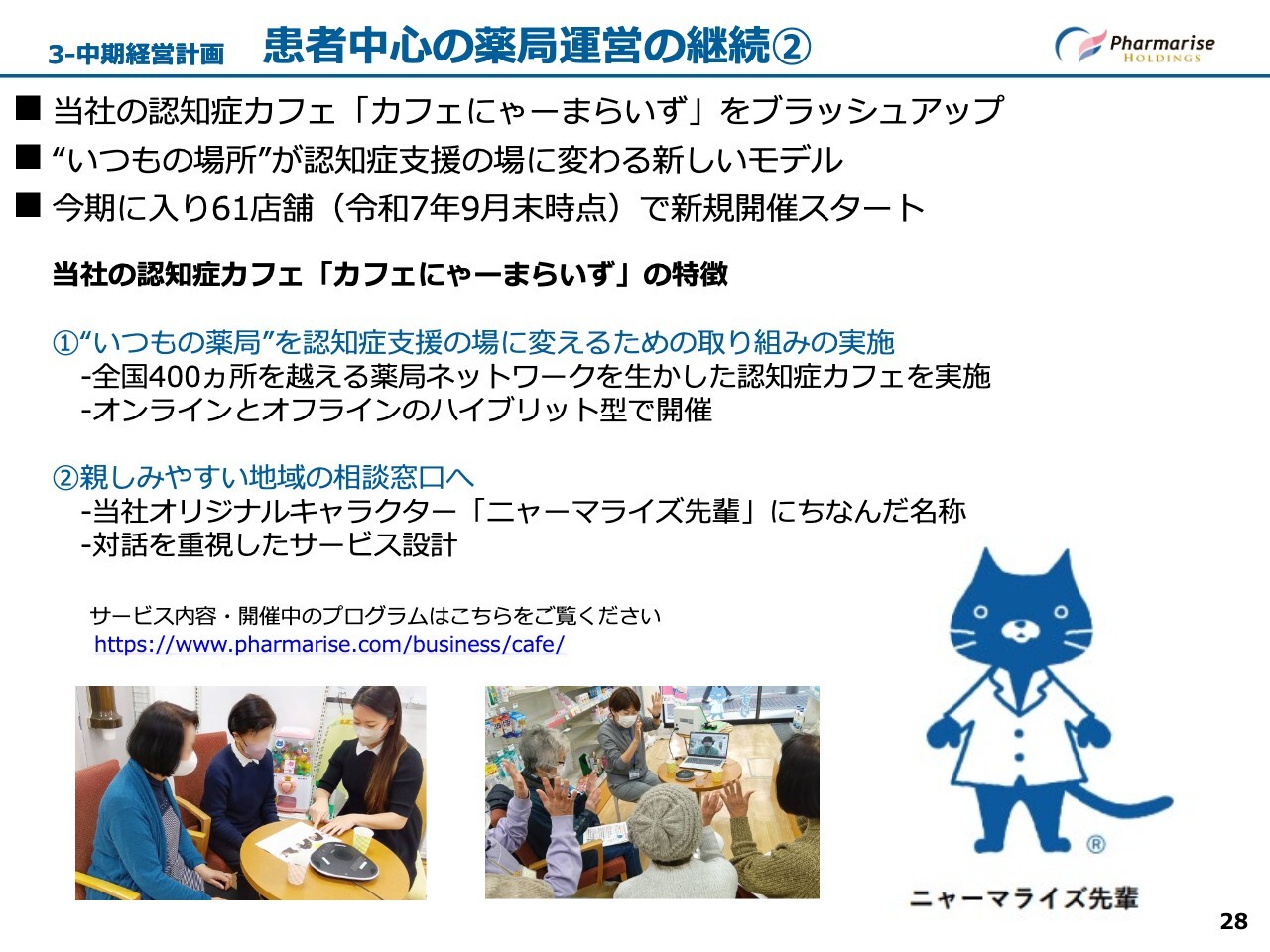 今後も、グループ入りした薬局の業務効率化や人員の適正化、ファーマライズグループのノウハウを活用した調剤技術料の算定アップなどに取り組み、通期計画を確実に達成し、次の成長につなげられるよう邁進していきたいと考えています。