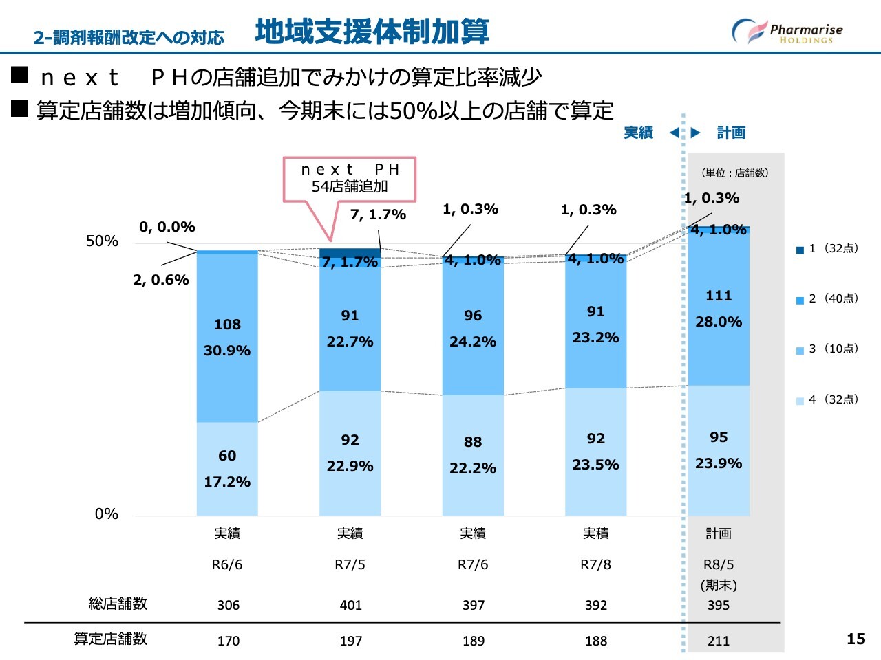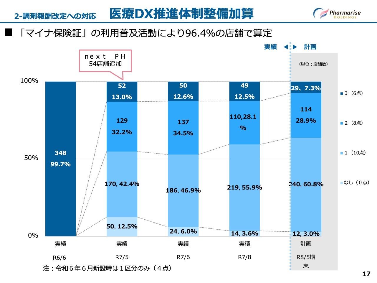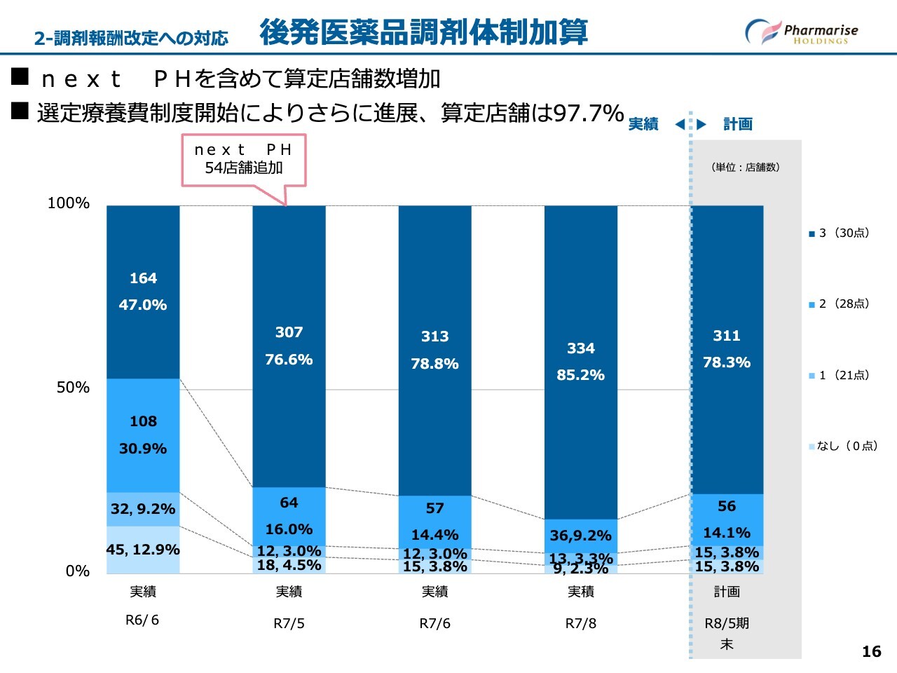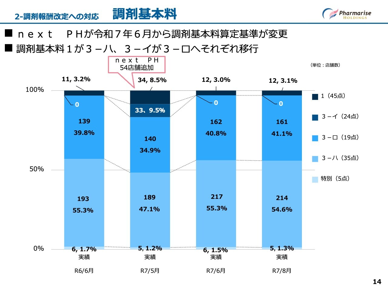 こちらのスライドは調剤基本料の状況です。第3四半期からnext PH社がグループに加わり、前期末である令和7年5月末時点では一時的に比率が変わっていました。next PH社では今年6月から300店舗以上のチェーングループが適用され、基本料1は3-ハへ、3-イは3-ロへ移行しました。