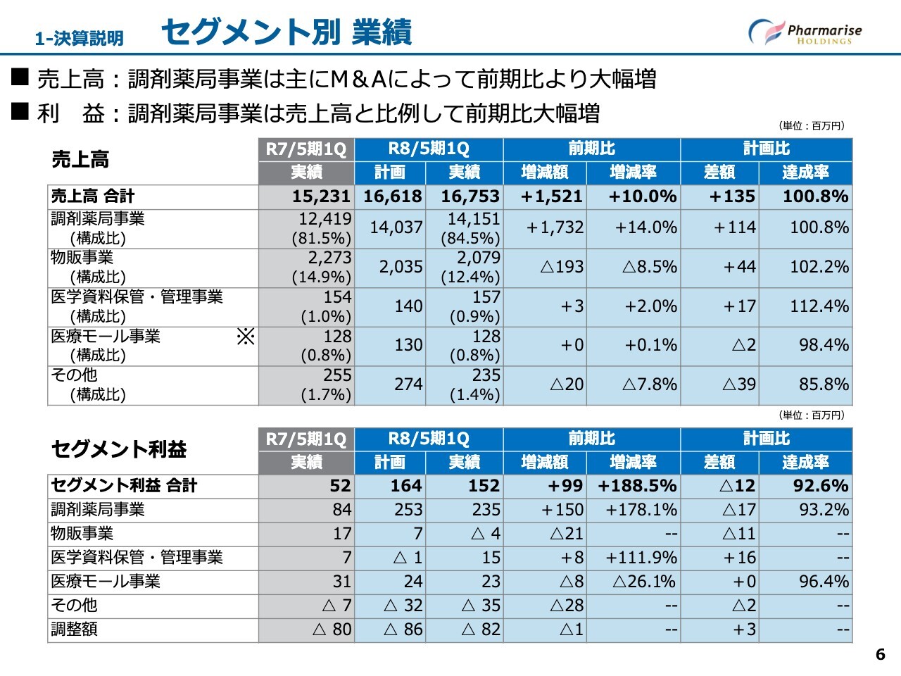 次に、セグメント別の業績についてご説明します。スライドの上段の表はセグメント別の売上高を、下段の表はセグメント利益を示しています。このスライドでは、主に調剤薬局事業および物販事業セグメントの売上高についてご説明します。