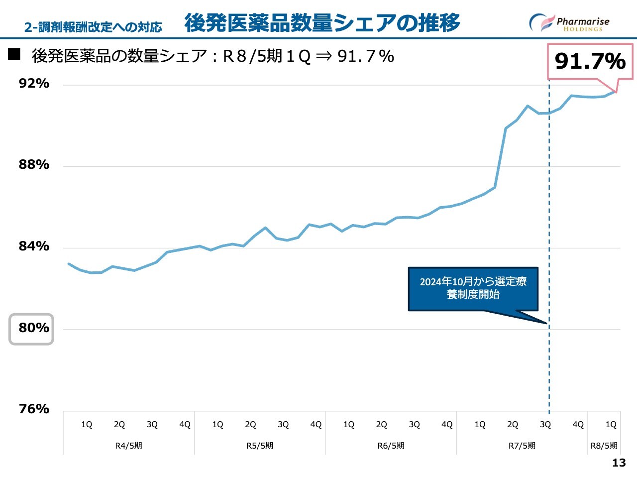 こちらのスライドは、当社における後発医薬品の数量シェアの推移を示しています。昨年10月から導入された、長期収載品を先発医薬品で調剤した際に患者側が一部自費負担となる選定療養費制度の影響で、数量シェアが大きく伸びました。当四半期でも引き続き高水準を維持しており、8月には91.7パーセントとなっています。