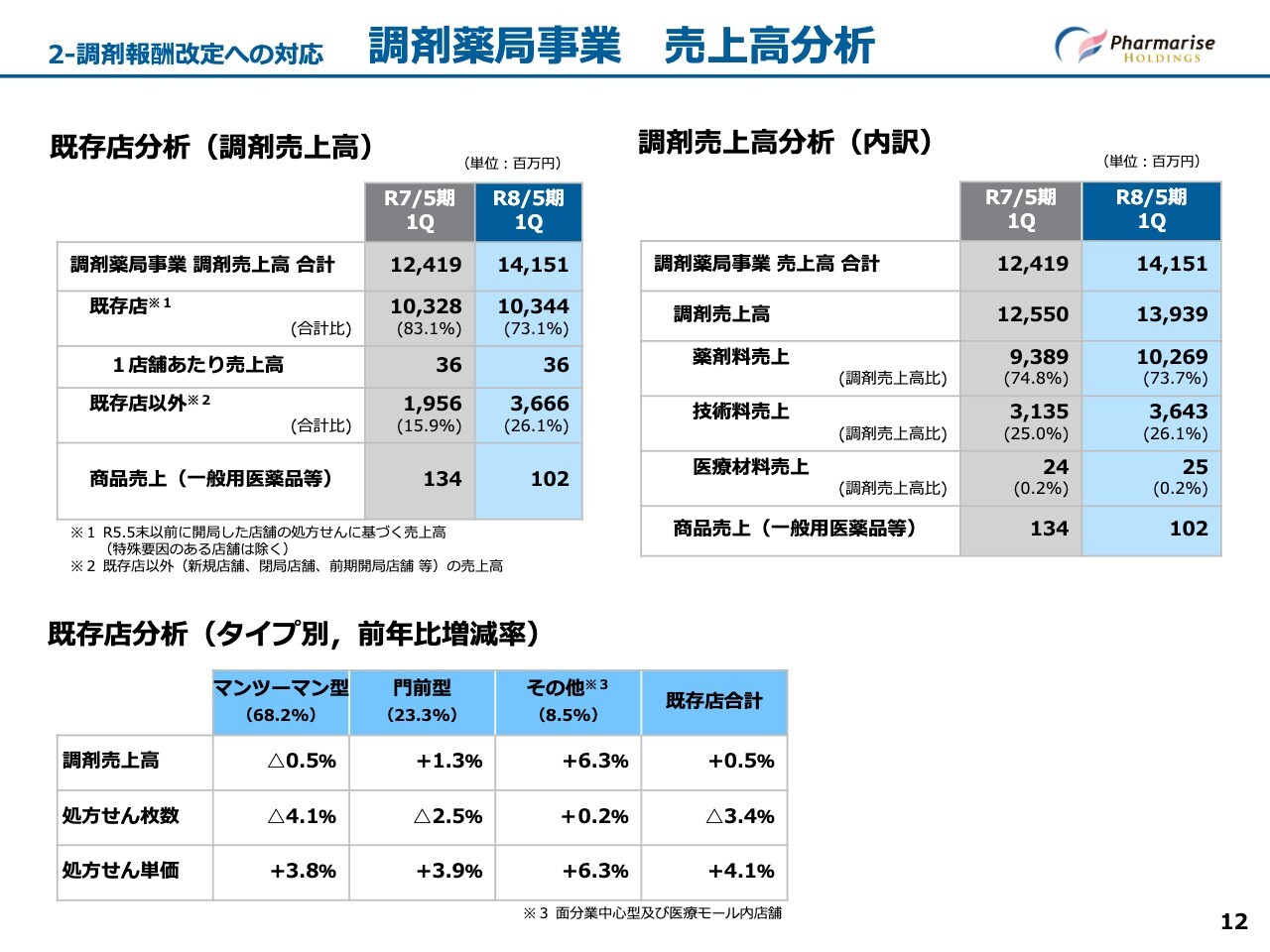 最後に、スライドの下の表は既存店におけるタイプ別の増減率を示しています。既存店全体では処方せん枚数が前期比3.4パーセント減少しましたが、処方せん単価が4.1パーセント上昇したことで、調剤売上高は前期比0.5パーセント増とわずかに増加しました。