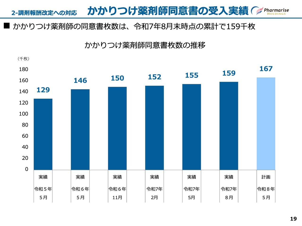 こちらは、かかりつけ薬剤師の同意書受け入れ実績です。当期は新規のかかりつけ患者が約1万3,000人増加すると見込んでおり、令和8年5月末の計画では16万7,000枚を予定しています。