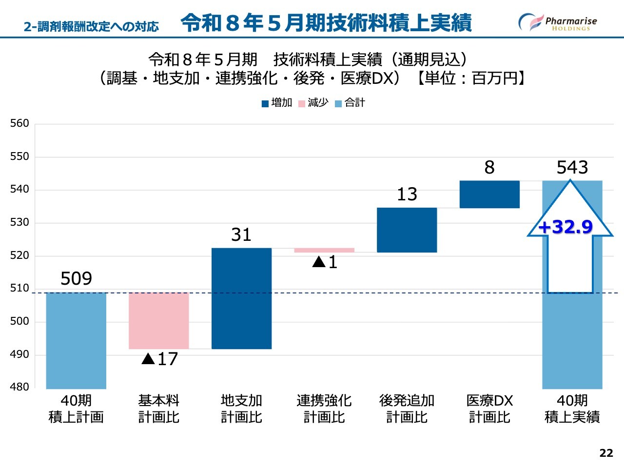 基本料の減少は、処方せん枚数が計画比でマイナス5万枚だったことによるものです。その他の項目については、連携強化加算がわずかにマイナスとなったものの、全体としては計画を上回る進捗を見せています。