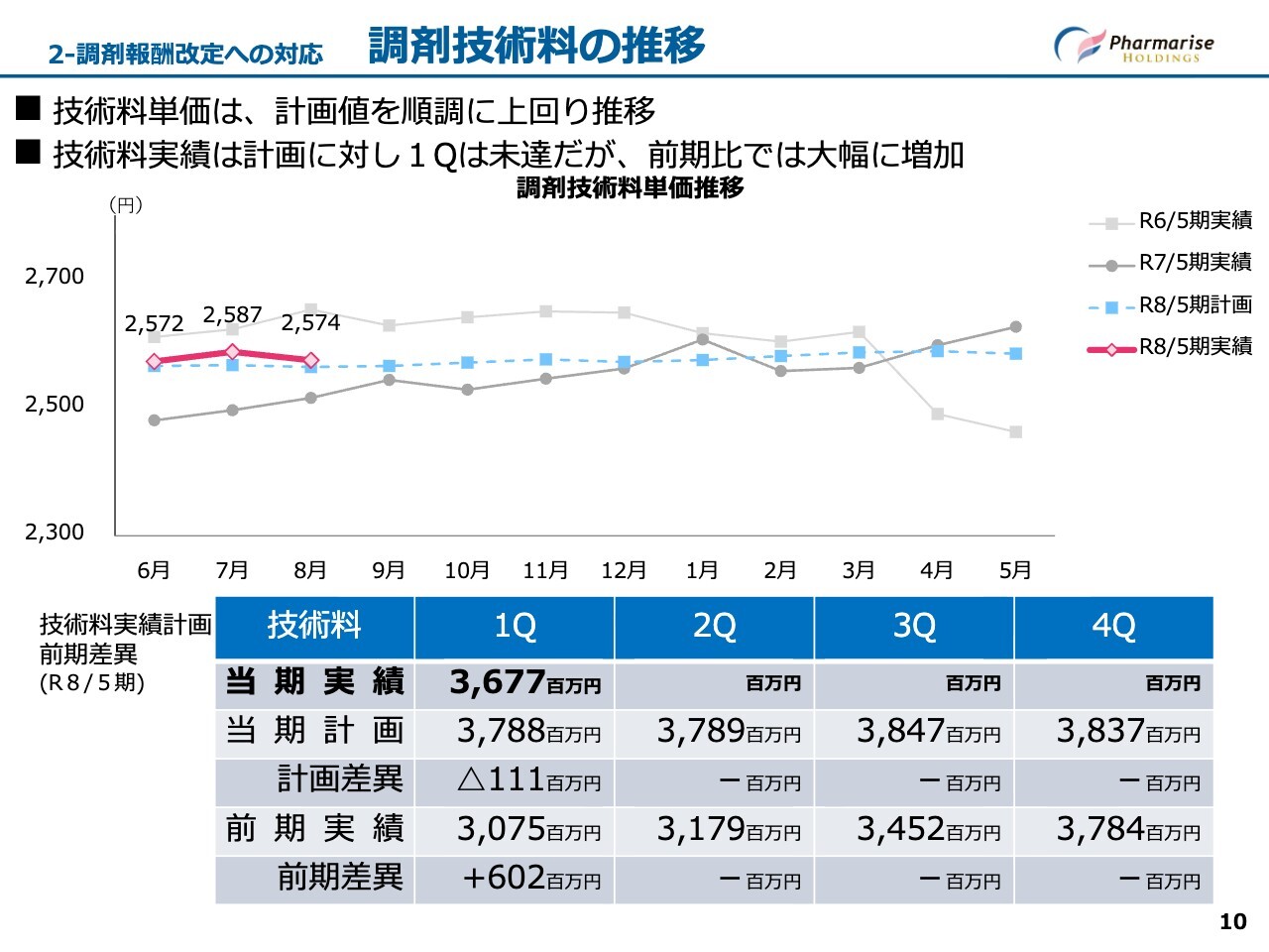 スライドの下段の表は、四半期ごとの調剤技術料の推移を示しています。技術料単価は計画を上回っているものの、処方せん枚数が想定より少なかったため、当四半期の実績は計画を下回る結果となりました。