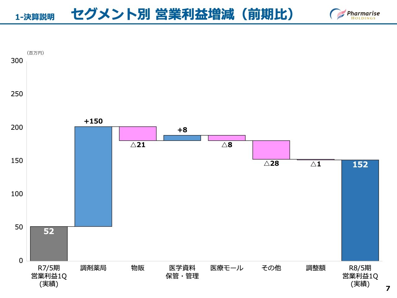 スライドの一番左は前年同期の実績営業利益5,200万円、一番右は当期の実績営業利益1億5,200万円です。中央のバーはセグメントごとの利益増減を示しており、まず大きな増益につながった調剤薬局事業についてご説明します。